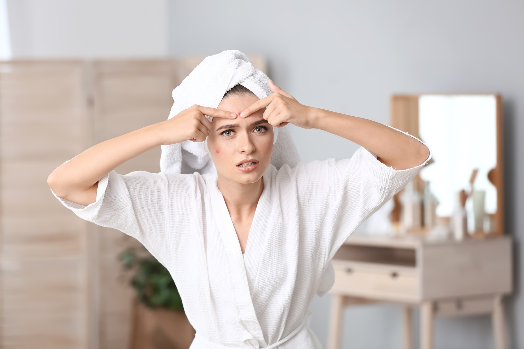 Portrait of young woman with acne problem squishing pimples at home,Image: 485173495, License: Royalty-free, Restrictions: , Model Release: yes, Credit line: Profimedia