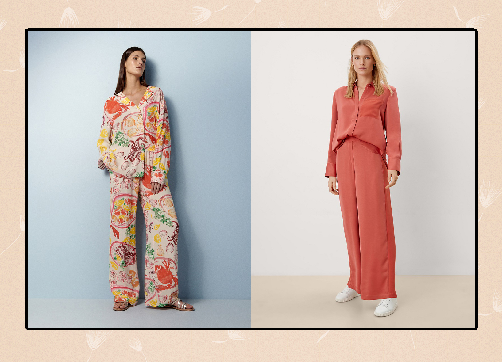 Zleva: Halenka 999 Kč, kalhoty 999 Kč, oba kousky Reserved; halenka 1.979 Kč, kalhoty 2.499 Kč, oba kousky s.Oliver