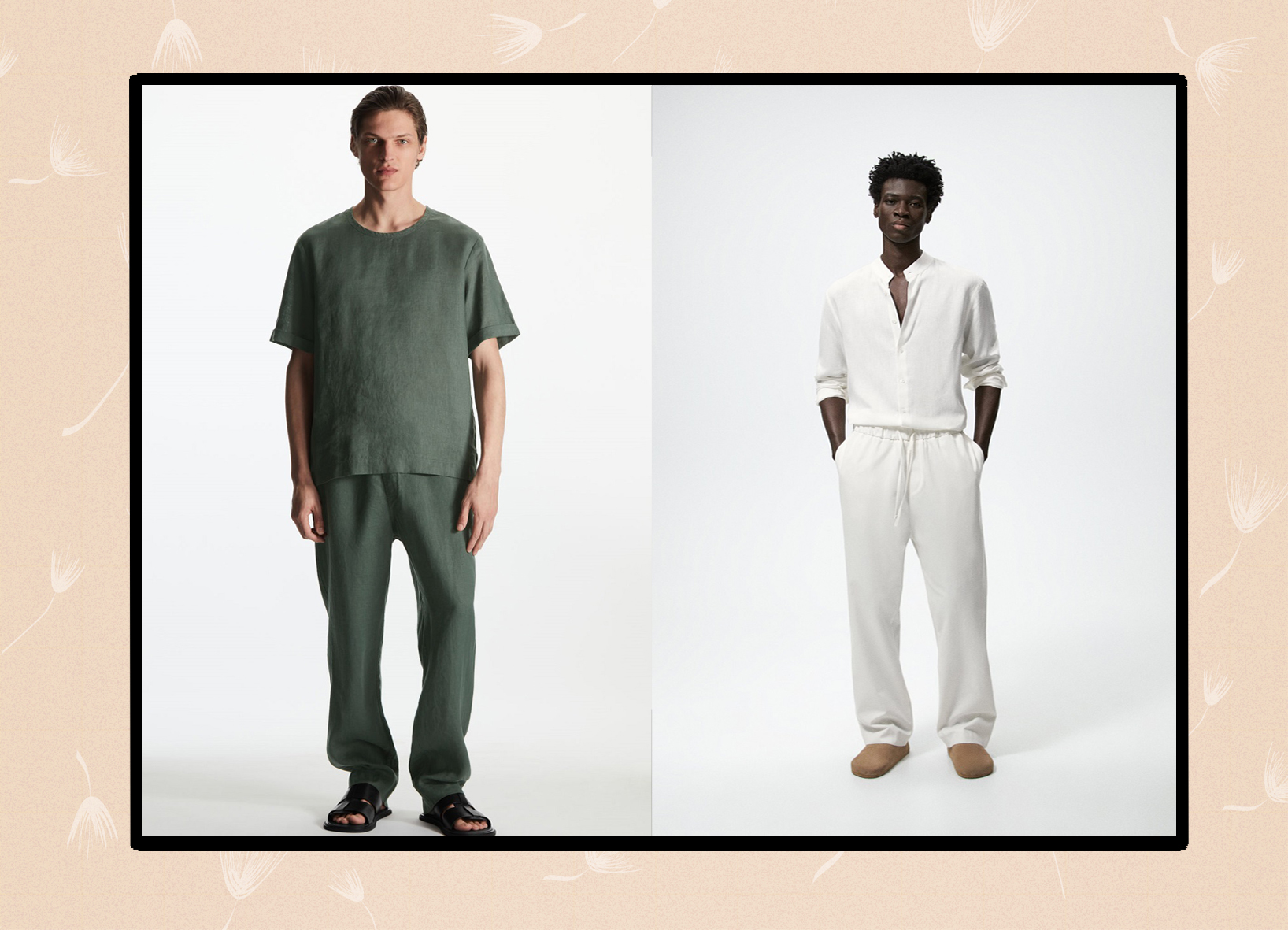 Zleva: Konopné tričko 1.210 Kč, konopné kalhoty 2.199 Kč, oba kousky COS; lněná košile 799 Kč, lněné kalhoty 999 Kč, oba kousky Zara