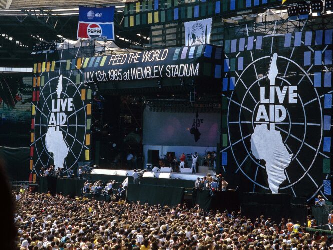 V pravé poledne za zvuků hymny God Save The Queen začal na londýnském stadionu Wembley doposud největší charitativní koncert, Live Aid. Po osmihodinovém programu, v rámci kterého vystoupili The Who, Status Quo, Queen, U2 a další, se připojila americká Philadelphia. Tam se na podiu vystřídali Black Sabbath, Run DMC, Madonna nebo Bryan Adams. Celý dvojkoncert sledovalo cca 40 % tehdejší světové populace. Hladovějící Africe diváci přispěli bezmála 300 miliony dolarů.
