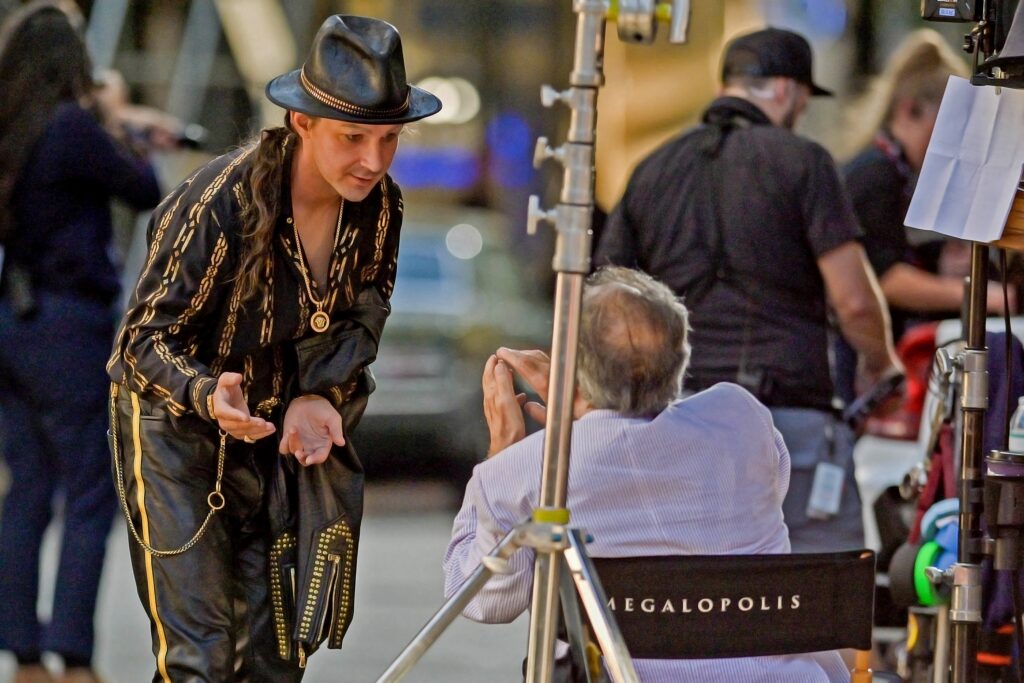 Shia LaBeouf na place filmu Megalopolis poslouchá pokyny režisérské legendy F. F. Coppoly (zády k fotografovi)