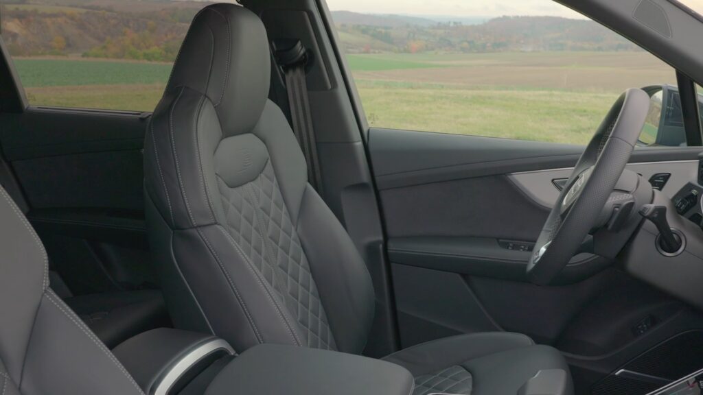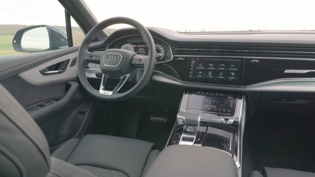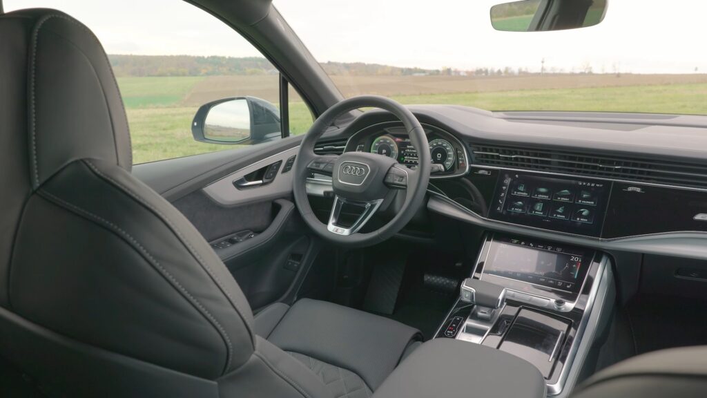 Ihned po usednutí musíte ocenit interiér. Ve velkých Audi už je to tradice, ale i tak nás dílenská kvalita a prvotřídní materiály opět nezklamaly. Skvělé sedačky, nadbytek místa i odkládacích prostorů, elegantní vícebarevné ambientní osvětlení, to všechno vytváří na palubě absolutní pohodu. Přispívá i perfektní odhlučnění podpořené samozřejmě faktem, že v městských podmínkách jezdí Audi Q7 téměř výhradně na elektřinu. Auto se implicitně zapíná v EV režimu a zkrátka se počítá s tím, že majitel bude přes noc auto nabíjet z domácího wallboxu, druhý den nejprve vyjezdí výrazně levnější elektrickou energii a až potom přejde na dražší benzín. Pokud se k tomu vůbec dostane. Pravda, elektrický dojezd reálně kolem 40 km už dnes u vozů PHEV patří spíš k těm nižším, ale pro denní jízdy i tak většině zákazníků bude stačit. Elektromotor samotný má 130 koní a 400 Nm, takže do města a blízkého okolí to naprosto stačí.