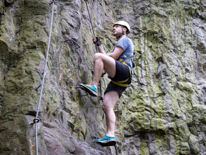 Na zajištěných cestách vedoucích po skále pak využívá lezec skalní chyty a stupy včetně stabilně osazených umělých prvků jako jsou ocelové kramle (skoby), kůly, žebříky a samozřejmě také ocelové lano. Právě po něm zájemce o adrenalinový zážitek leze a hlavně se za něj jistí. „Obě karabiny zacvaknete do jistícího ocelového lana a stoupáte vzhůru. V místě, kde je lano ukotveno ke skále, se postupně přecvaknete jednou i druhou karabinou a pokračujete dále. Na vrcholu si následně dáte svačinu a vyfotíte se,“ doplňuje se smíchem Michovský.