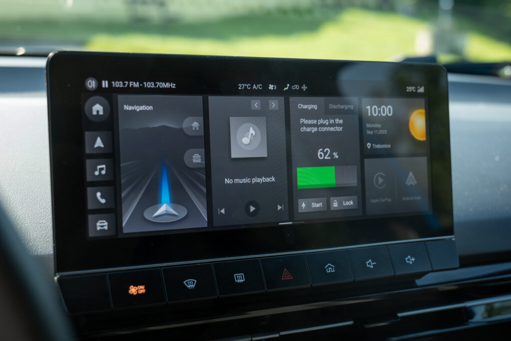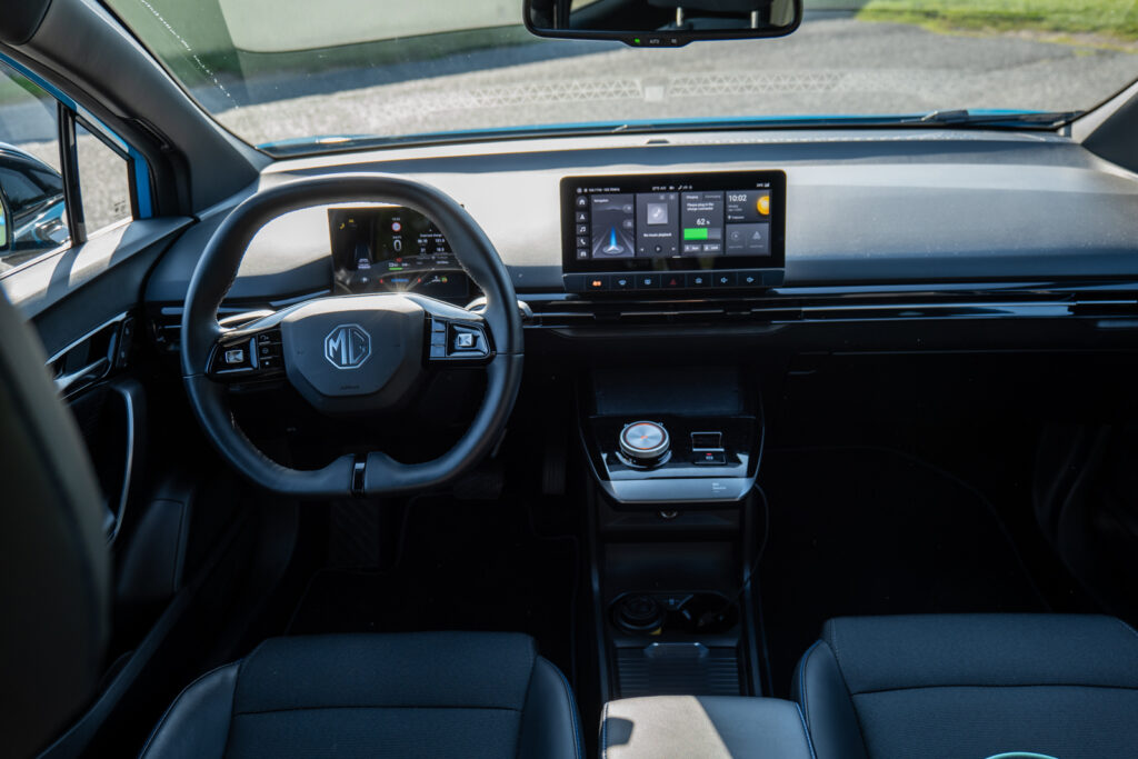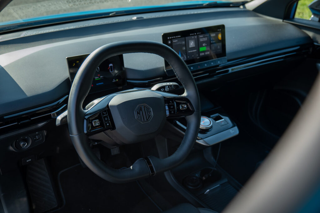 Celkově ale MG4 nevypadá vůbec špatně a tento dojem se nezhorší ani po nasednutí. Interiér je prostorný, zadní sedák má příjemný sklon, takže tam i vyšší cestující budou mít pohodlí, vpředu je velký infotainment, který fungoval bez problémů. Jen za bezdrátový přenos Apple CarPlay si musíte připlatit čtyři tisícovky, ale je fajn, že automobilka tuto možnost vůbec nabízí. Je těžko pochopitelné, proč to jinde nejde. Bezdrátové nabíjení mobilu je ale v základní výbavě, stejně jako parkovací kamera, automatická klimatizace, bezpečnostní a asistenční systémy, 17” litá kola a tak dále. Zklamala nás nemožnost rychlého ovládání rekuperačního brzdění. Musíte kvůli němu do menu infotainmentu a obsahuje jen tři různé úrovně a automatickou volbu, chybí jak režim plachtění bez rekuperace, tak ovládání auta jedním pedálem. Na volantu ale najdete několik programovatelných tlačítek, včetně dvou všesměrových joysticků, takže si ovládání rekuperace můžete přiřadit k nim, stejně jako ovládání klimatizace, které rovněž postrádá své vlastní fyzické ovladače.