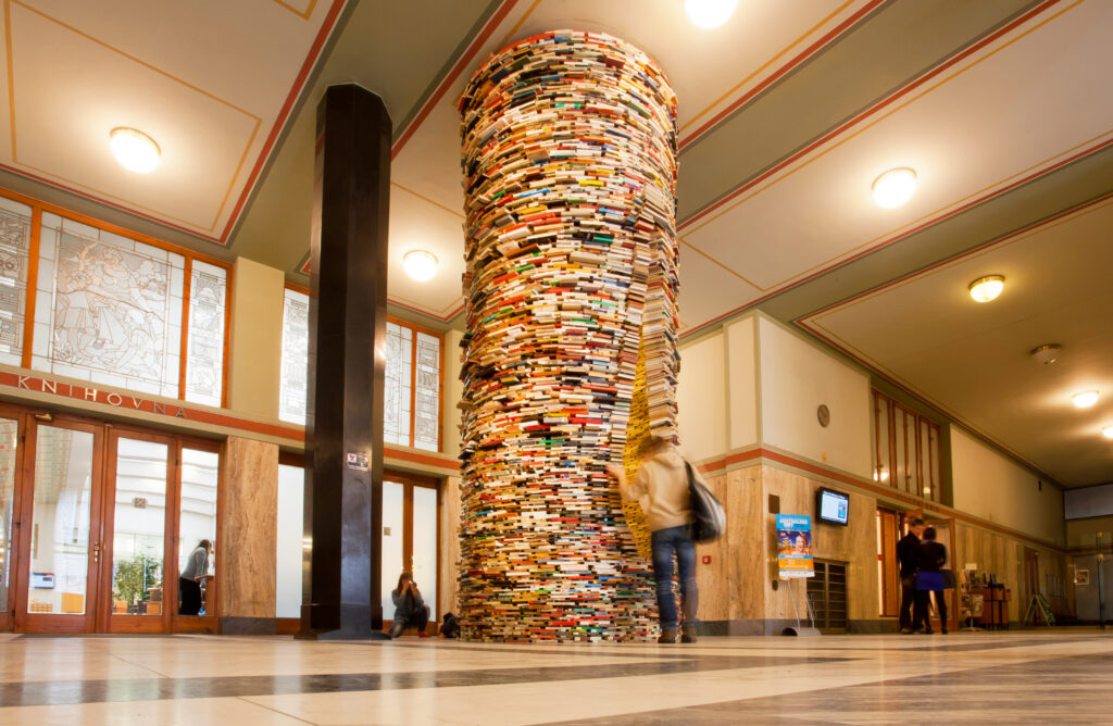 Ve vestibulu Městské knihovny na Mariánském náměstí najdete dílo Idiom výtvarníka Mateje Kréna, instalace z osmi tisíc knih se na konci loňského roku stala hitem sociálních sítí, turisté na ni stáli frontu