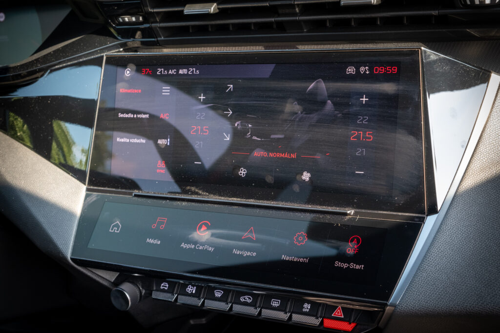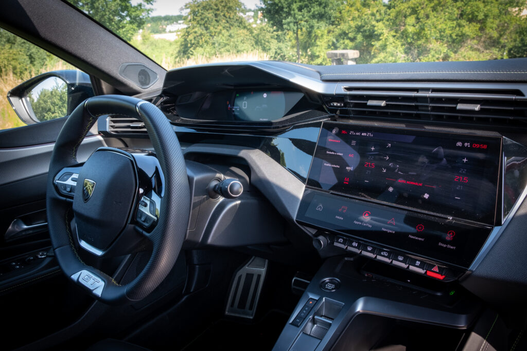 V interiéru vás uvítá ergonomicky diskutabilní koncept i-Cockpit s malým a šišatým volantem umístěným nízko nad vašimi koleny a digitálním kokpitem v kapličce těsně pod čelním sklem. Ve větších autech se v něm hledá slušná poloha trochu lépe než třeba v malé 208, ale stoprocentní to pořád není, to prostě a jednoduše nejde. Každý instruktor bezpečné jízdy vám potvrdí, že ideální poloha za volantem nových Peugeotů prostě neexistuje. Pochválit ale musíme kvalitu materiálů i celkový design zbytku interiéru, obojím Peugeot zdárně dotahuje i podstatně prémiovější soupeře. Také infotainment je lépe naladěný než dřív a pod hlavní dotykovou obrazovkou přibyl další dotykový displej, sloužící jako lišta rychlých voleb. Můžete si jí přizpůsobit svým preferencím a ovládání systému za jízdy výrazně zjednodušuje.