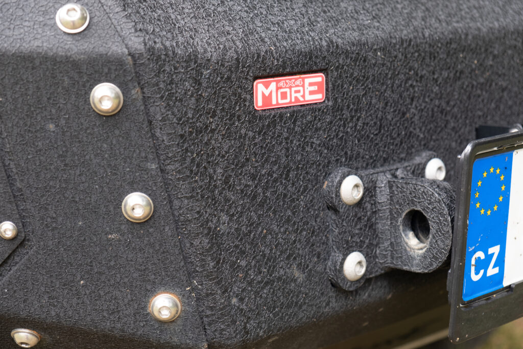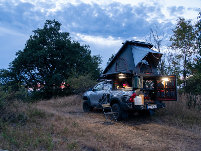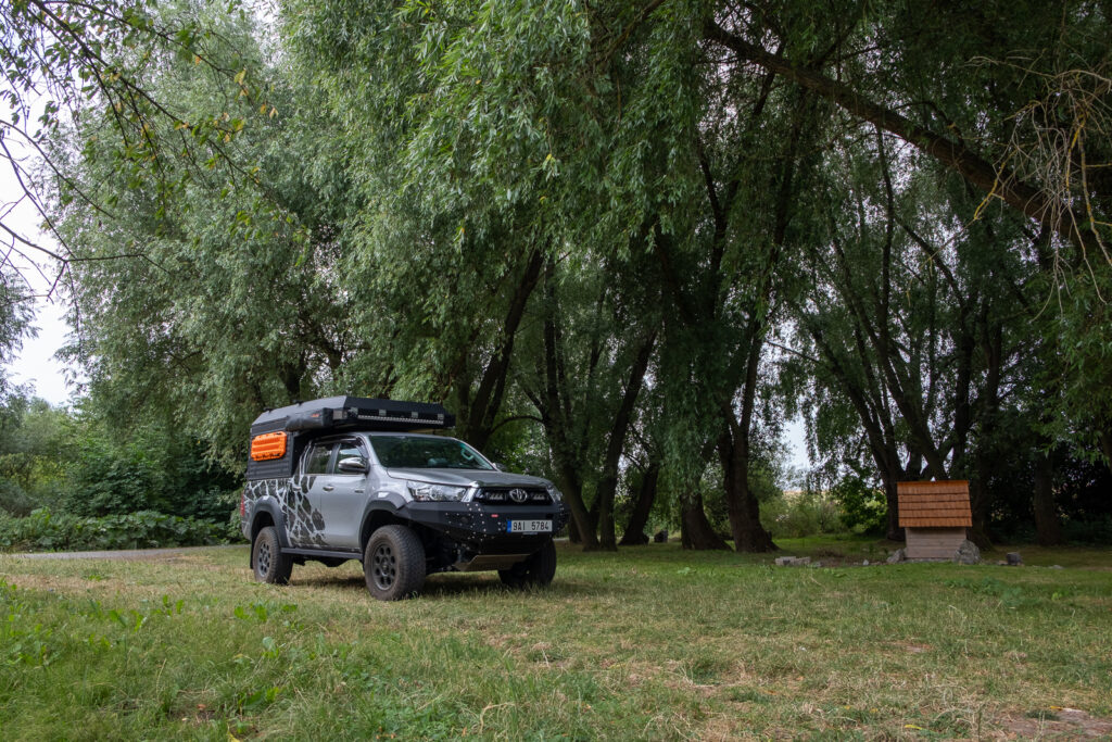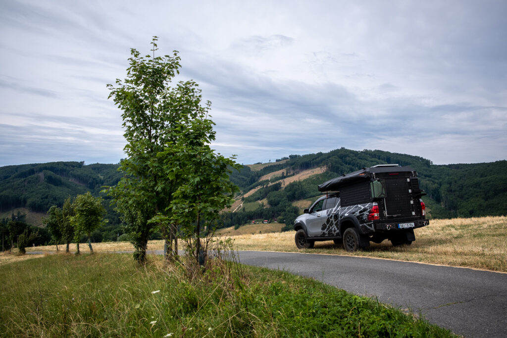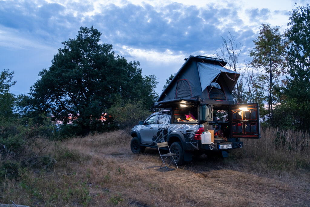 Zrovna tyhle pneumatiky nejsou na úplně nejdrsnější offroad, což je dobře, protože na silnicích tolik nehučí a dá se s nimi přežít i delší cesta. A Honza se vydal křížem krážem přes celé Čechy i Moravu, aniž by musel hledat hotely. Když totiž skončila práce polské formy More4x4, nastoupila jihoafrická společnost AluCab, která dodala expediční nástavbu napevno namontovanou do korby vozu. Bytelná černá krabice se během minuty dokáže změnit v překvapivě prostorný obytný prostor. Ze střechy se vyklopí stan pohodlný i pro dva extrémně vysoké lidi, kolem vozu se rozprostře samonosná markýza, která zajistí sucho i při nepříznivém počasí. Samotný prostor nad korbou pojme nejen spoustu vašich zavazadel, ale také šedesátilitrovou nádrž na vodu a šestilitrový bojler, napájející vnější teplou sprchu, plus 100 Ah baterii živenou solárním panelem namontovaným na výklopnou střechu. K dispozici je samozřejmě i konvertor na 220 Voltů, takže nabíjení notebooků a dalších přístrojů je hračka. V celé nástavbě jsou rozeseté USB porty, takže mobil a hodinky si nabijete i nahoře u postele. S tímhle autem prostě nemusíte hledat nejen hotel, ale ani kemp. Vystačíte si i v totální divočině.
