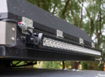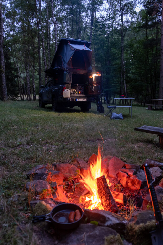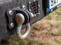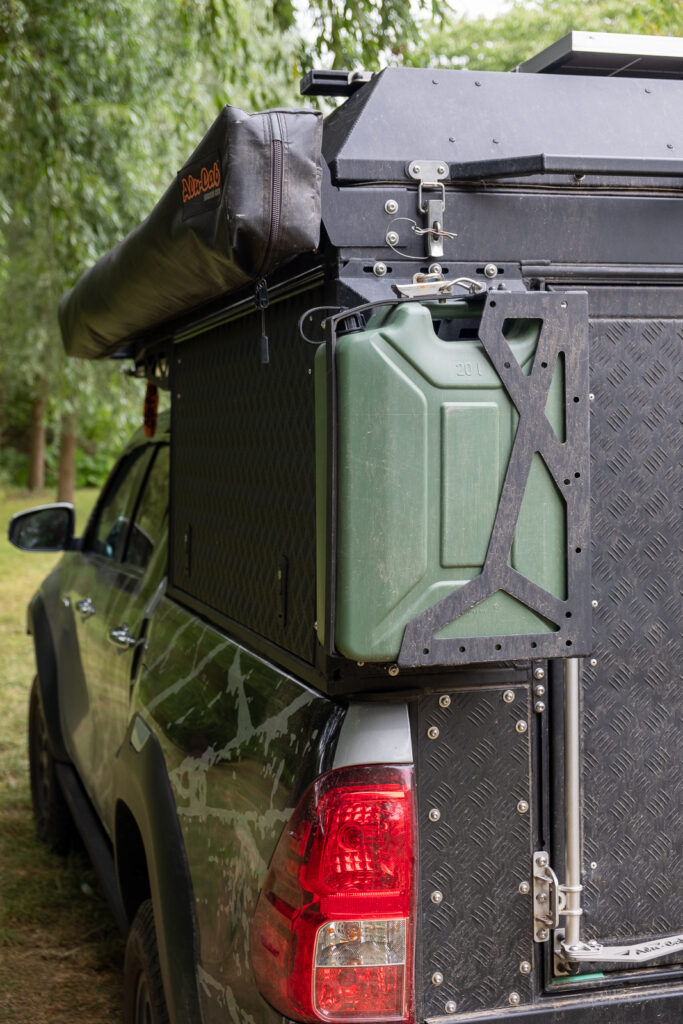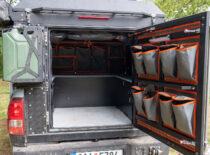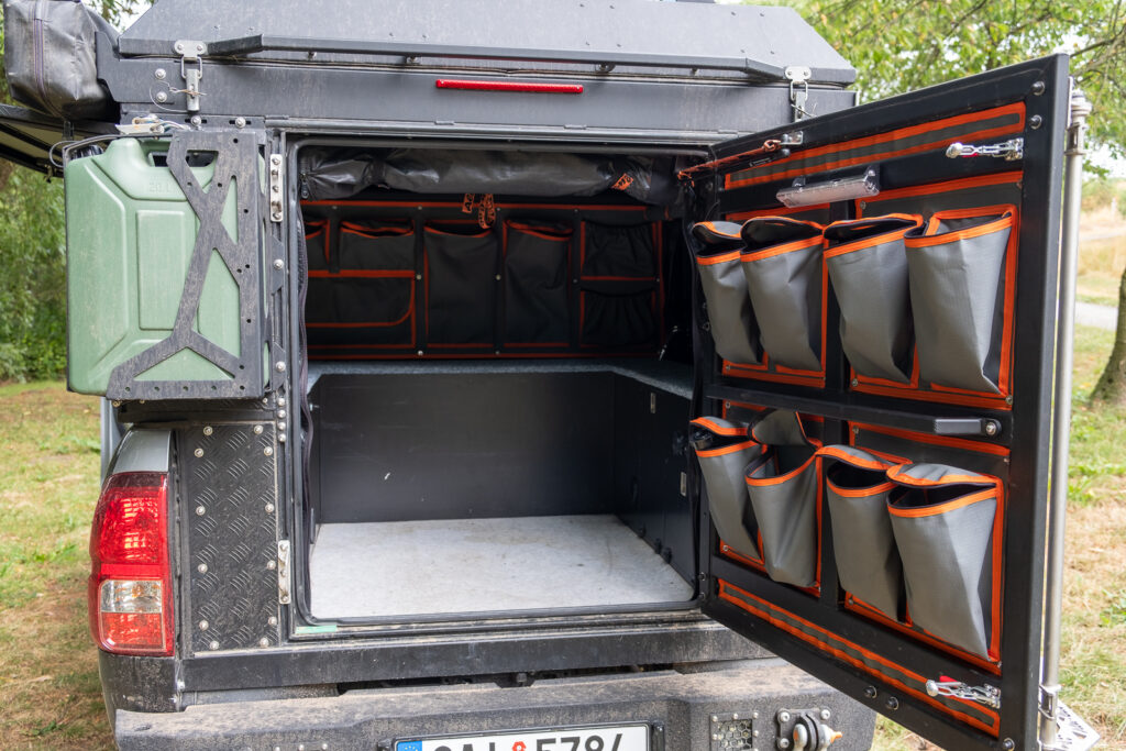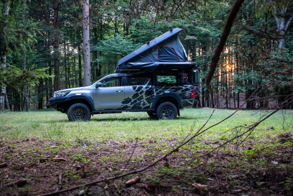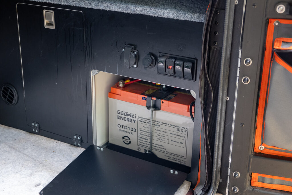 Zrovna tyhle pneumatiky nejsou na úplně nejdrsnější offroad, což je dobře, protože na silnicích tolik nehučí a dá se s nimi přežít i delší cesta. A Honza se vydal křížem krážem přes celé Čechy i Moravu, aniž by musel hledat hotely. Když totiž skončila práce polské formy More4x4, nastoupila jihoafrická společnost AluCab, která dodala expediční nástavbu napevno namontovanou do korby vozu. Bytelná černá krabice se během minuty dokáže změnit v překvapivě prostorný obytný prostor. Ze střechy se vyklopí stan pohodlný i pro dva extrémně vysoké lidi, kolem vozu se rozprostře samonosná markýza, která zajistí sucho i při nepříznivém počasí. Samotný prostor nad korbou pojme nejen spoustu vašich zavazadel, ale také šedesátilitrovou nádrž na vodu a šestilitrový bojler, napájející vnější teplou sprchu, plus 100 Ah baterii živenou solárním panelem namontovaným na výklopnou střechu. K dispozici je samozřejmě i konvertor na 220 Voltů, takže nabíjení notebooků a dalších přístrojů je hračka. V celé nástavbě jsou rozeseté USB porty, takže mobil a hodinky si nabijete i nahoře u postele. S tímhle autem prostě nemusíte hledat nejen hotel, ale ani kemp. Vystačíte si i v totální divočině.