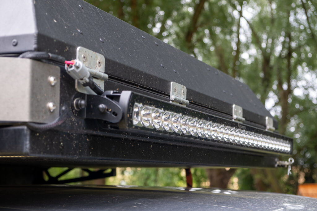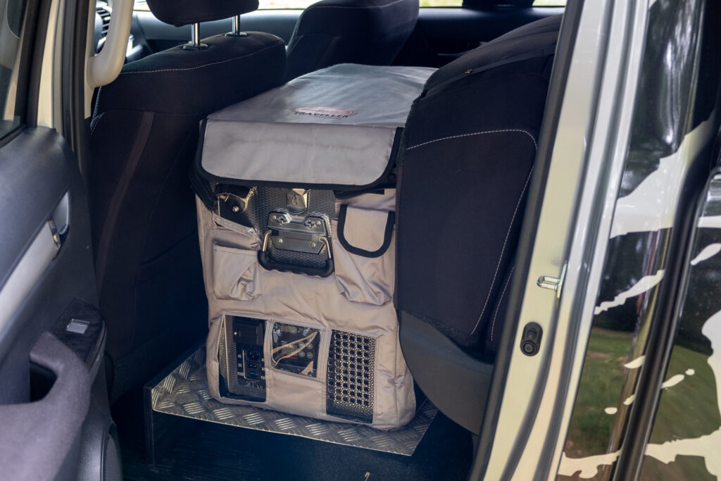 Hilux nemá vnitřní kuchyňku, počítá se s tím, že budete žít spíš kolem auta a uvnitř budete jen spát. Ovšem spaní je to luxusní. Do střešního stanu se leze vnitřkem zadní nástavby, takže suchou nohou, nahoře je pohodlná matrace téměř 2,5metrové délky, k dispozici je nezávislé naftové topení, které v zimě jistě přijde vhod a solárem napájená baterka s konvertorem na 220 voltů utáhne přes noc velkou cestovní ledničku i nabíjení kamer, počítačů a tak dále.