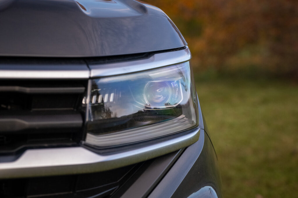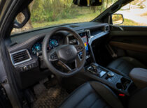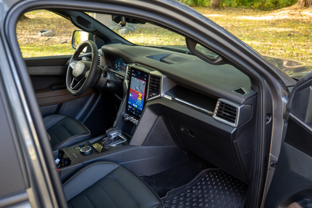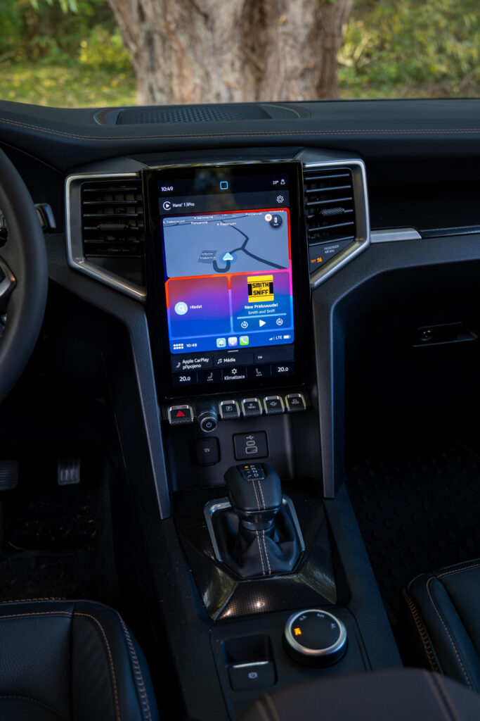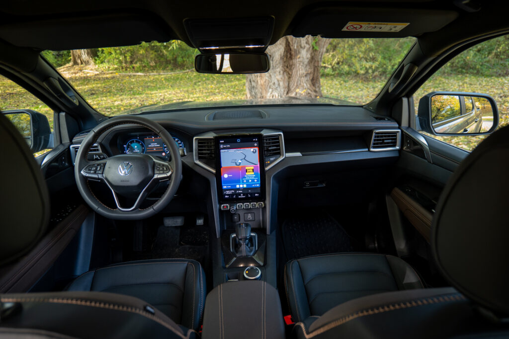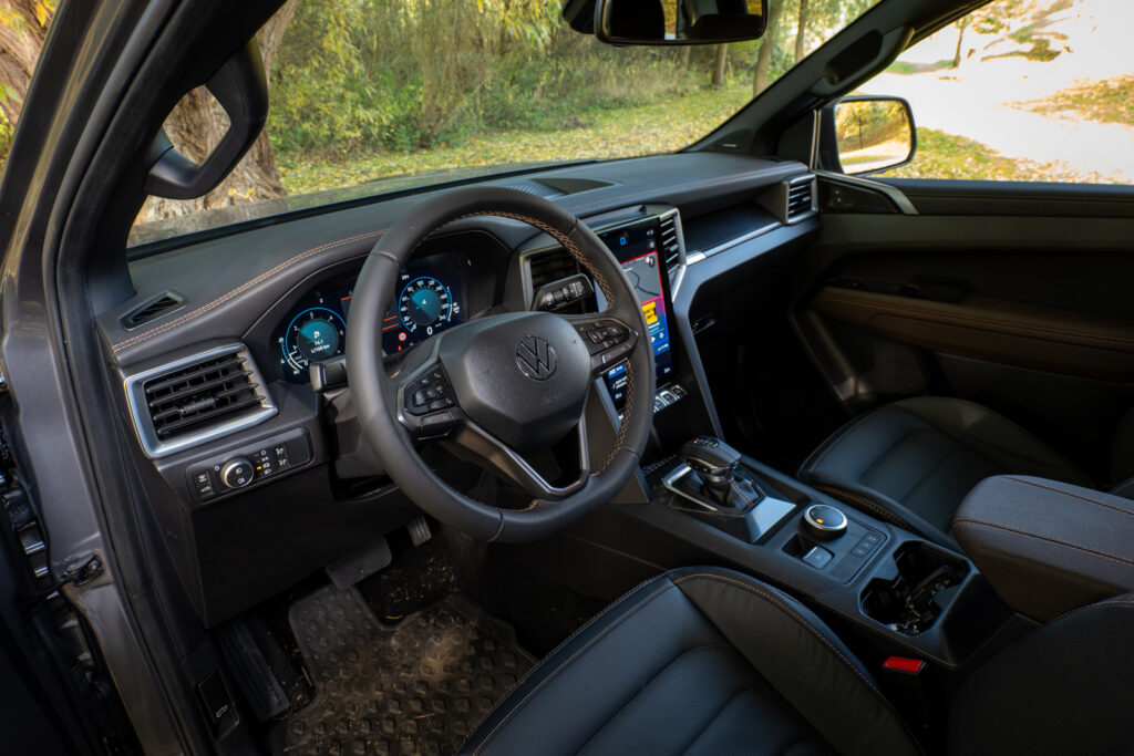 Rozdíly v interiéru jsou podstatně decentnější, takže člověk zvyklý na Volkswageny brzo pozná, že v Amaroku něco nehraje. Je tu na výšku orientovaný displej infotainmentu s jinak uspořádaným softwarem a také spousta spínačů a ovládacích prvků nepřipomíná nic z koncernového kyblíku součástek. To ale není žádná velká kritika, Amarok totiž uvnitř vypadá skutečně luxusně. Minimálně to tedy platí o testované verzi PanAmericana. Jde o druhou nejvyšší výbavu, která přináší kožené čalounění, multibarevné ambientní osvětlení, prémiovou čalouněnou palubní desku nebo audioaparaturu Harman Kardon. Pořád sice z některých detailů poznáte, že tohle auto je především pracovní nástroj, ale rozhodně jsme si v něm nepřipadali kdovíjak ochuzeně. Zamrzí některé záseky v systému infotainmentu: Je trochu nepřehledný a verze v testovacím autě si nedokázala udržet některá nastavení. Je ale možné, že jsou to dětské nemoci, které se snad podaří časem vyladit. Už tu funguje aktualizace vzduchem, takže by to nemusel být takový problém.