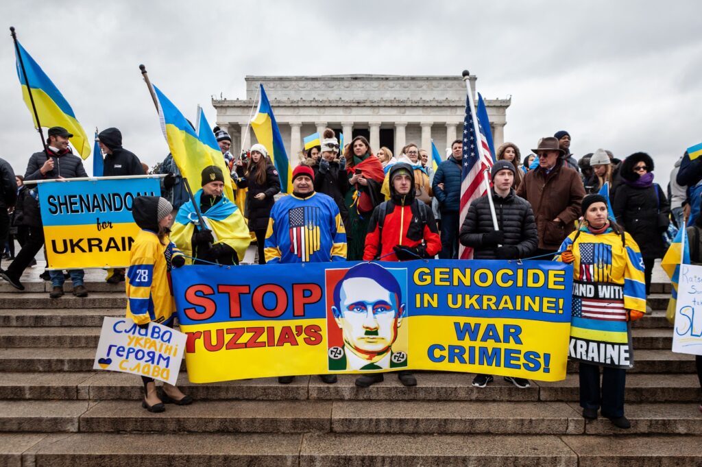 Ruský vládce je často označován jako válečný zločinec, na fotce je shromáždění k výročí roku od zahájení války ve Washingtonu