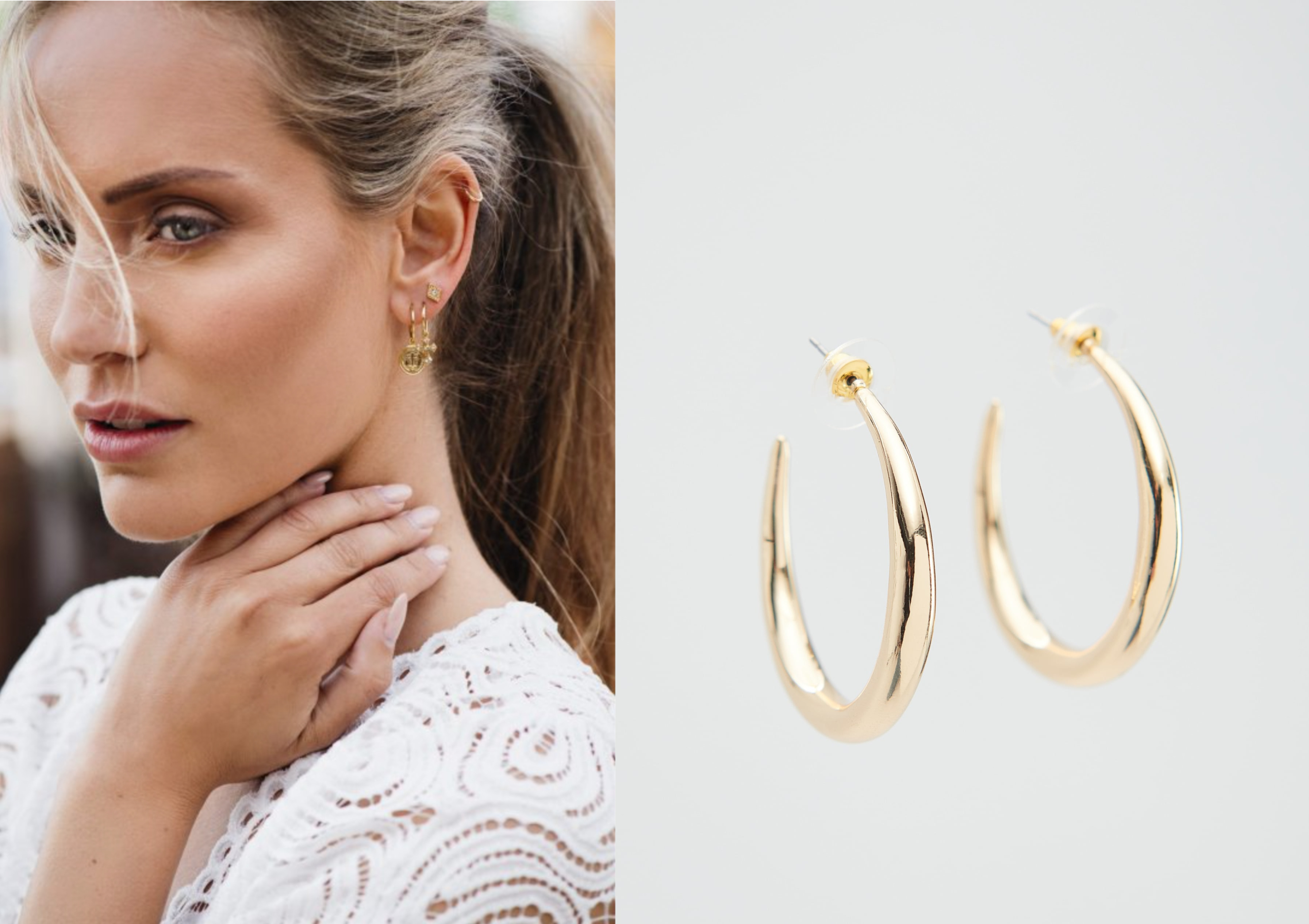 Zleva: kruhové pozlacené náušnice bez přívěsku Eline Rosina (prodává Ornamenti), 390 Kč; náušnice Reserved, 199 Kč