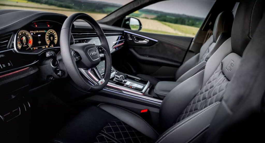 Naživo vypadá Audi SQ8 mohutně, ale nepůsobí nesmyslně obřím dojmem. Je rozkročené a zvlášť v kombinaci šedivého nemetalického laku a lesklé černé masky a 23palcových kol v sobě zajímavým způsobem snoubí dravost a chladnou německou eleganci. Uvnitř je to typické high-end Audi: Tři dokonale kontrastní displeje s nastavitelným zobrazením, spousta klavírního laku, lišty z pravého hliníku a sedačky, v našem případě vyhřívané, odvětrávané i masážní, čalouněné jemnou kůží. Samozřejmostí je armáda kvalitně kalibrovaných jízdních pomocníků, umožňujících semiautonomní jízdu po dálnici. Audi SQ8 dokáže být i na velkých kolech velmi pohodlné a tiché. Při klidné jízdě kvalitně supluje limuzínu a bez nejmenších problémů v něm překonáte i dlouhé cesty přes půlku Evropy.