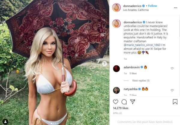 Nedávno bývalá hvězda Pobřežní hlídky sdílela na sociální síti odvážné fotky v bílých sexy bikinách. Její fanoušci jsou zcela fascinováni tím, že v 53 letech vypadá jako čerstvá dvacítka. Objevily se však i kritické hlasy, které jí vyčítají, že používá příliš mnoho filtrů a retuší. S hatery si modelka jednoduše poradila, omezila možnost komentování příspěvků. Její Instagram je plný vyzývavých fotek, dle slov modelky si však musí dodat odvahu, aby tyto typy fotek zveřejnila. Říká, že ač na fotkách může působit sebejistě, ve skutečnosti tomu tak není a je velmi rozpačitá ohledně toho, jak na fotkách vypadá. Alespoň to píše pod jedním ze svých příspěvků, kde odvážně pózuje v mokrém bílém tričku. Donna D'Errico také přiznává, že její krása není zcela přírodní. Například v roce 2017 si v jeden den nechala odsát tuk z paží a břicha, který nechala lékaře přesunout na vhodnější místo – do oblasti boků. Po těchto zákrocích si je údajně sama sebou zase o trochu jistější, když pózuje v sexy bikinách.