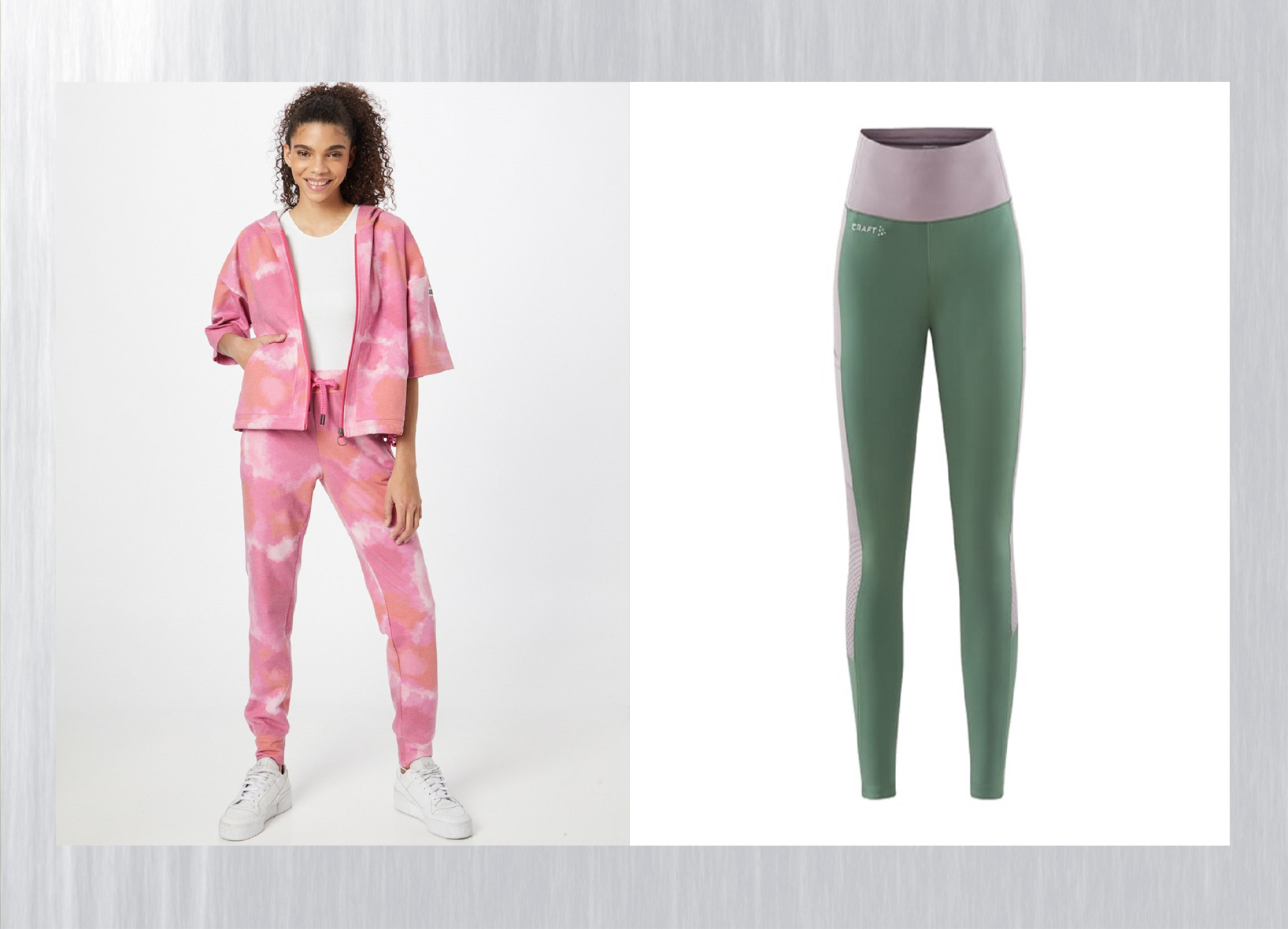Zleva: Tepláky z recyklovaných PET lahví Torstai (prodává About You), 1.479 Kč; dámské elastické kalhoty z 72% recyklovaného polyesteru Craft, 1.350 Kč