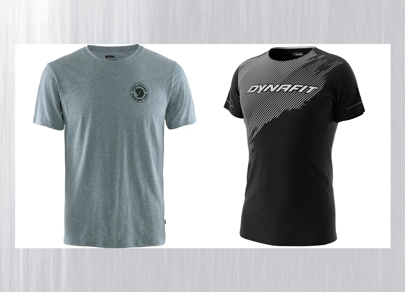 Zleva: Pánské tričko z bio bavlny a recyklovaného polyesteru Fjällräven, 1.190 Kč; pánské funkční tričko z recyklovaného polyesteru Dynafit (prodává 4camping), 1.290 Kč
