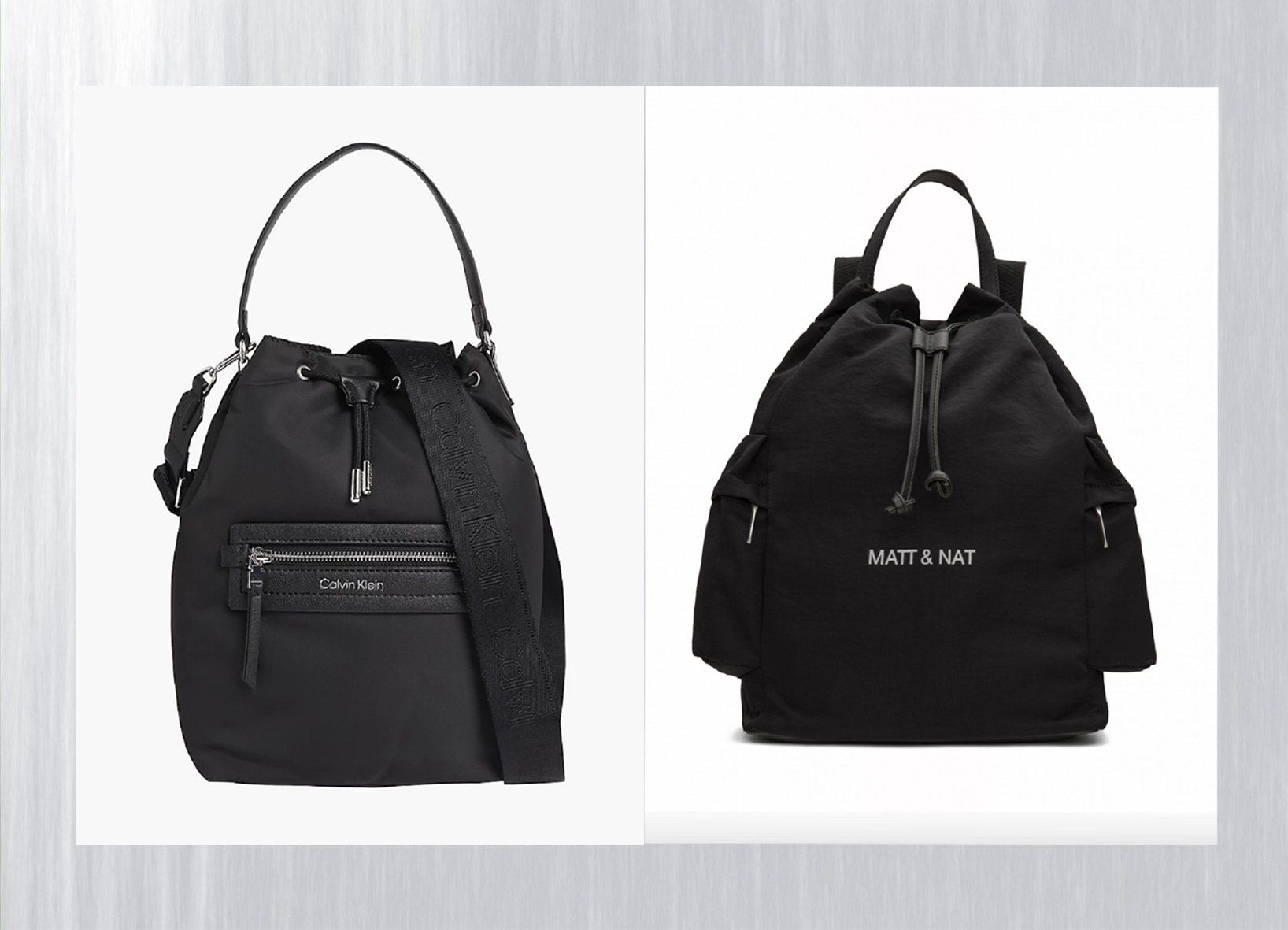 Zleva: Kabelka ze čtyř recyklovaných PET lahví Calvin Klein, 3.290 Kč; přebalovací taška z podšívkou ze 100 % recyklovaných PET lahví Matt & Nat (prodává Urbanlux), 5.190 Kč