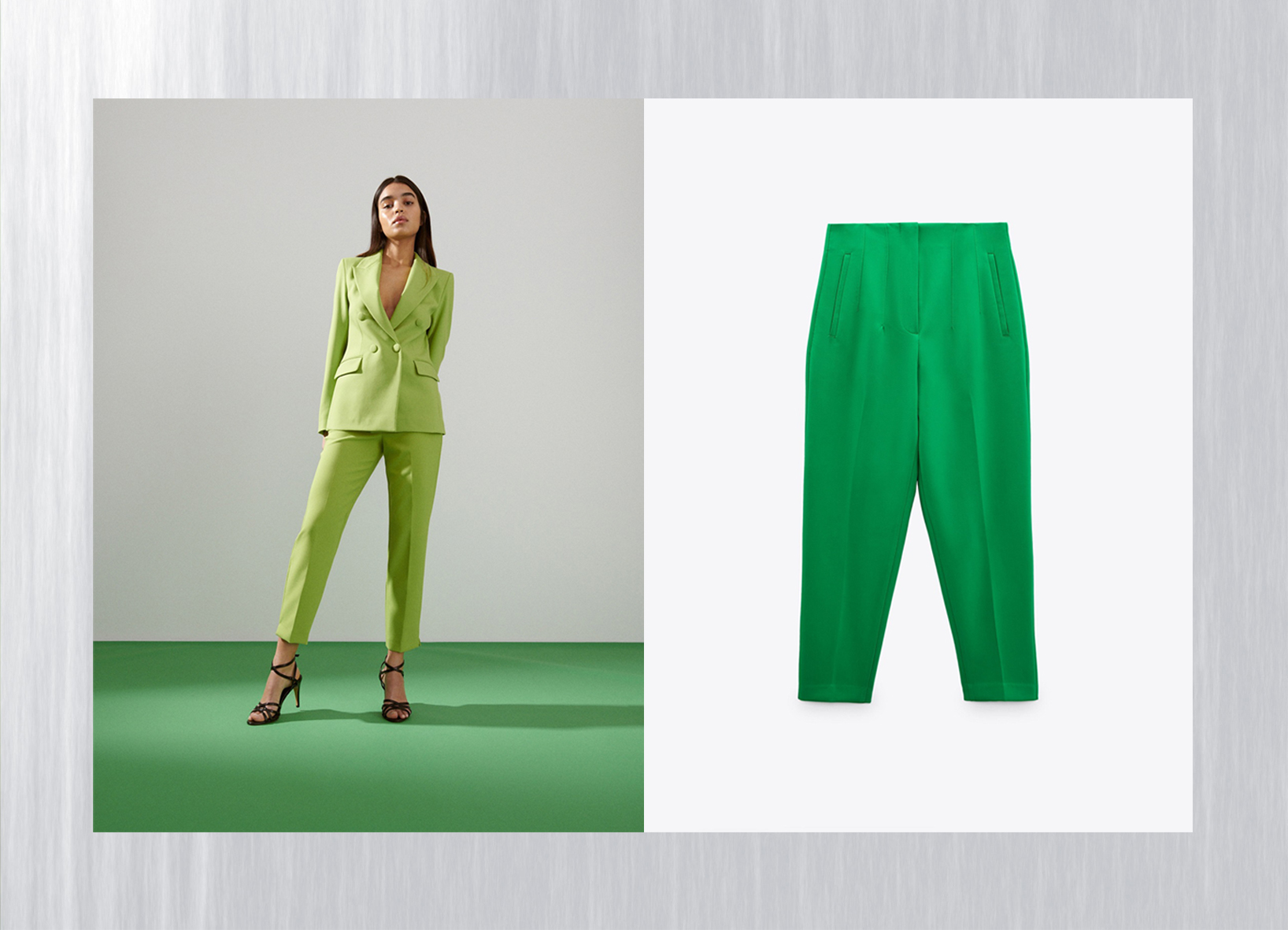 Zleva: Žlutozelené kalhoty z recyklovaného polyesteru Reserved, 799 Kč; zelené kalhoty z recyklovaného polyesteru Zara, 699 Kč