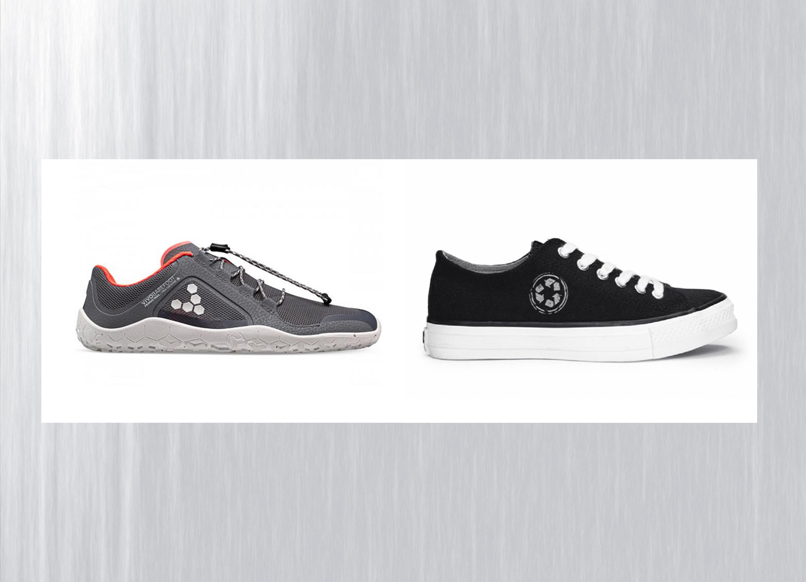 Zleva: Dámské veganské tenisky z recyklovaných PET lahví Vivobarefoot, 3.690 Kč; unisexové veganské tenisky z recyklovaného plastu NAE (prodává Etik Butik), 1.750 Kč
