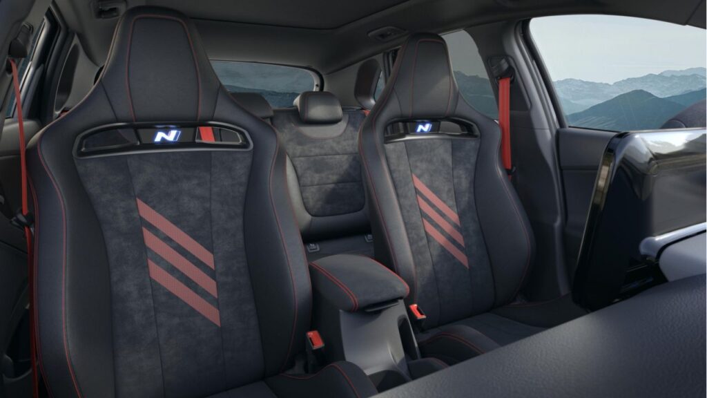 Auto je dozdobené černými logy a nápisy a samozřejmě polepy ve zlato-černo-červené kombinaci. Bílý perleťový lak, kterým bylo opatřeno testované auto, je za příplatek 10 tisíc, jinak dostanete černou perleť. Na předním blatníku se pak vyjímá plaketka s nápisem Drive-N Limited a číselným kódem, který v sobě skrývá souřadnice testovacího centra divize N u německého Nürburgringu. Po nastoupení vás uvítají sportovní sedačky čalouněné kombinací kůže a Alcantary, tímto umělým semišem je potažený také volant, středová loketní opěrka, hlavice řadící páky a madlo ruční brzdy. Všechno je to prošívané červenou nití, červené jsou i bezpečnostní pásy a především tlačítka volby jízdních režimů na volantu, která jsou jinak v autech divize N standardně bledě modrá. S jejich pomocí si můžete velmi podrobně přizpůsobit nastavení auta, včetně takových jemných nuancí, jako jsou tři různé úrovně razance automatických meziplynů, neboli srovnání otáček při řazení. Posledním přídavkem do interiéru je plaketa s pořadovým číslem. Testovací kus byl 595. vyrobený z 600.