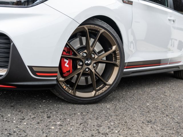 Základní cena limitované verze povedeného ostrého hatchbacku, který se vyrábí v českých Nošovicích, je o 100 tisíc vyšší než u verze i30 N Performance. Konkrétně 900 tisíc za verzi s manuálem, 8stupňovou dvouspojkovou převodovku s automatickým řazením a možností manuálního režimu si Hyundai cení o 50 tisíc víc. Drive-N má v ceně další výbavu: Například panoramatické střešní okno, za které se jinak připlácí 30 tisíc. Zrovna to se do ostrého hatchbacku moc nehodí, protože přidává spoustu kilogramů na střechu a zvyšuje tak zbytečně těžiště auta. Drive-N navíc přihodí i věci, které k běžnému provedení i30 N nedostanete. Nejviditelnější jsou unikátní kovaná kola v matně tmavě bronzové barvě, obutá do pneumatik Pirelli 235/35 R19.