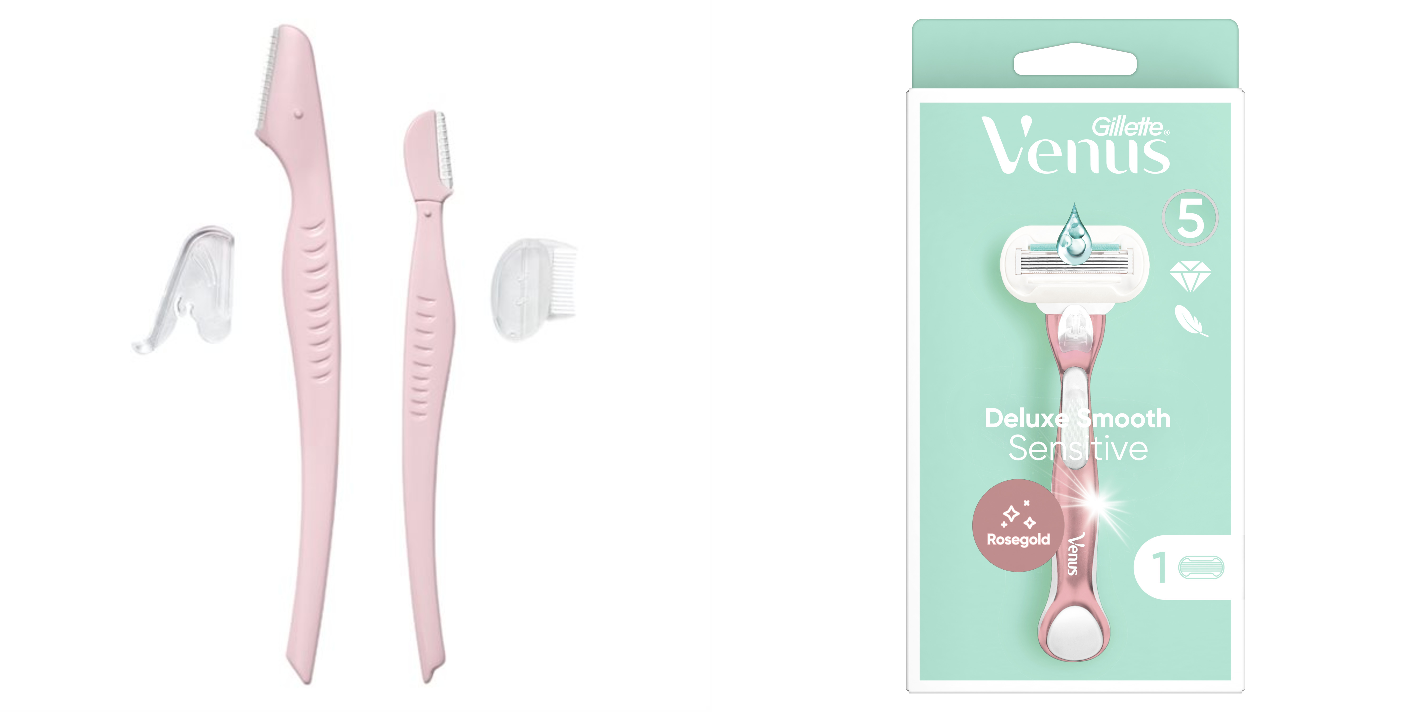 Zleva: Sada žiletek na obličej a obočí Avon, 89 Kč; dámský holicí strojek Gillette Venus Rosegold pro citlivou pokožku, 299 Kč