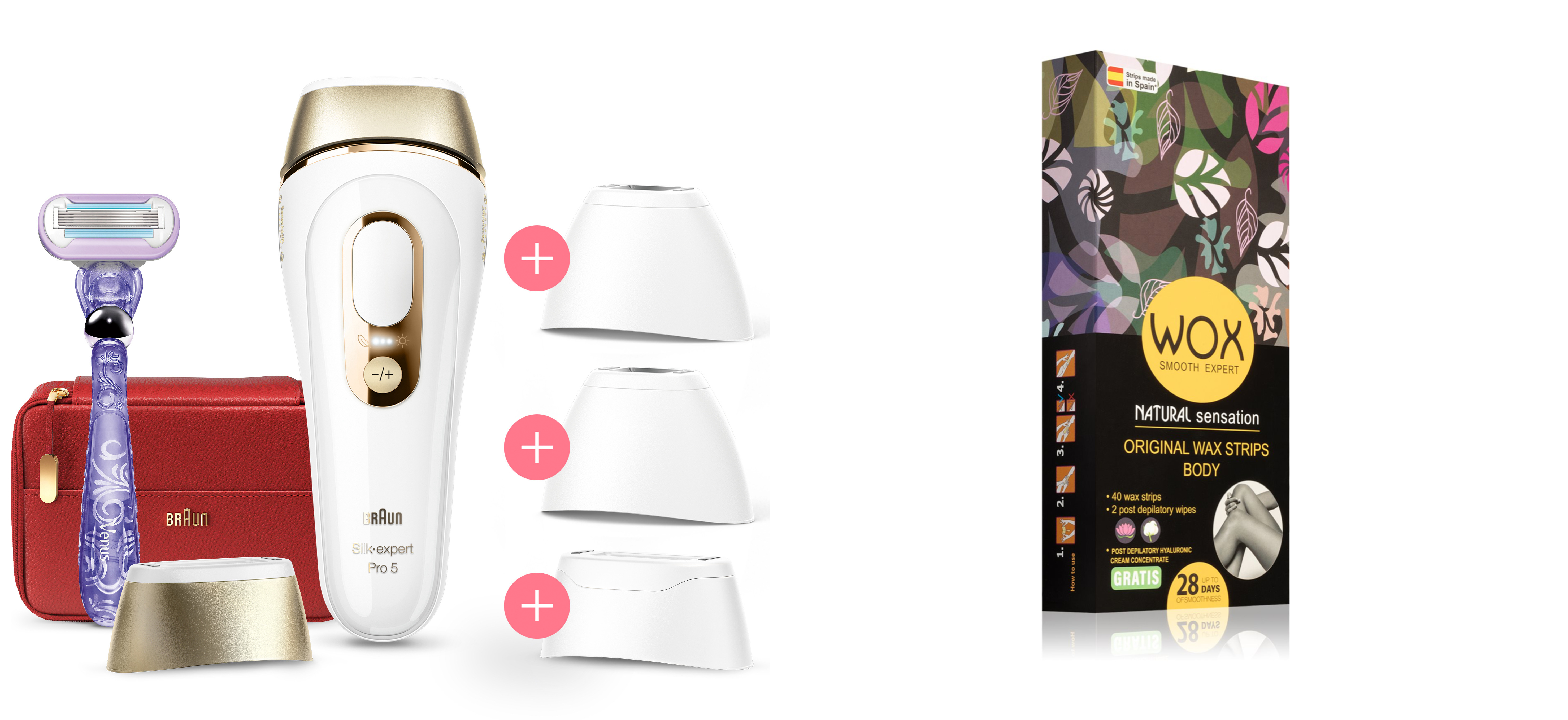 Zleva: Přístroj s technologií IPL zajistí hladkou pokožku až na 6 měsíců, Braun Silk expert Pro 5, 15.499 Kč; voskové depilační pásky na tělo pro hladkou pokožku na několik týdnů, WOX (prodává Notino), 134 Kč