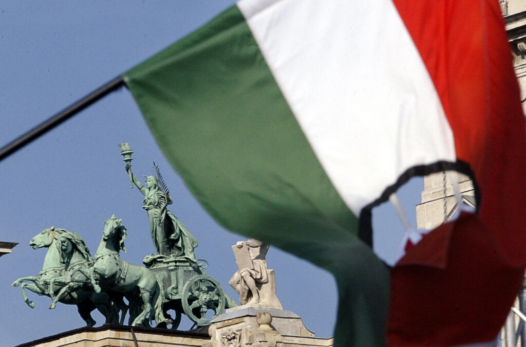 Demonstranti umisťují maďarskou vlajku bez sovětského emblému uprostřed na pozůstatky svržené obří sochy sovětského vojáka