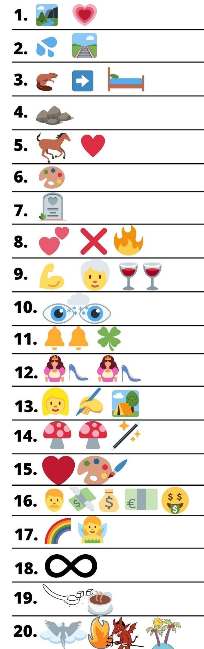 Na obrázku vidíte 20 obrázkových zadání. Emotikony jsou nápovědou k názvu písničky, vaším úkolem je zjistit, o který český song se jedná. Přijdete na všech 20? Pokud k nim zvládnete přiřadit správně i interprety, jste skutečným znalcem českých hitů.