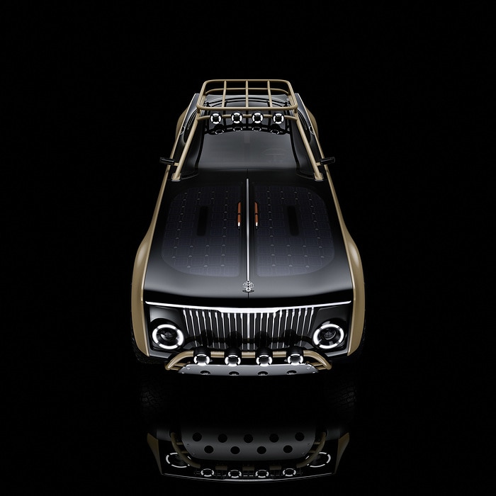 Project Maybach, jak Mercedes tuhle nezvyklou poctu nazval, se těžko popisuje. Téměř šest metrů dlouhé kupé má nizoučkou střechu, ale vysoký a hranatý ponton karoserie, obrovské terénní pneumatiky, masivní ochranné kryty nárazníků a podvozku, nýtované nástavce blatníků a kolem kabiny vnější ochrannou klec s integrovaným střešním nosičem. Neuvěřitelně dlouhá kapota motoru obsahuje solární panely, na obdélníkové přídi i zádi najdete kulaté diodové světlomety – vpředu pak doplněné ještě dvěma čtveřicemi přídavných světel na nárazníku a na přední straně střešního nosiče.