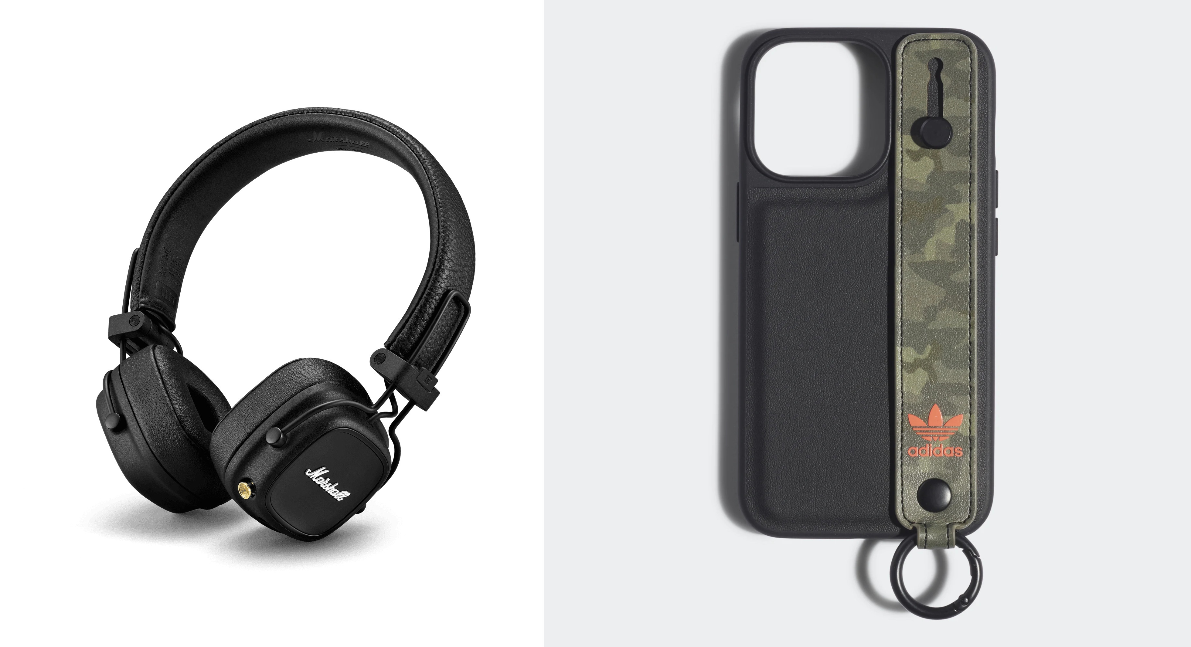 Zleva: bezdrátová sluchátka Marshall, 3629 Kč; obal na iPhone 13 Pro Adidas, 799 Kč