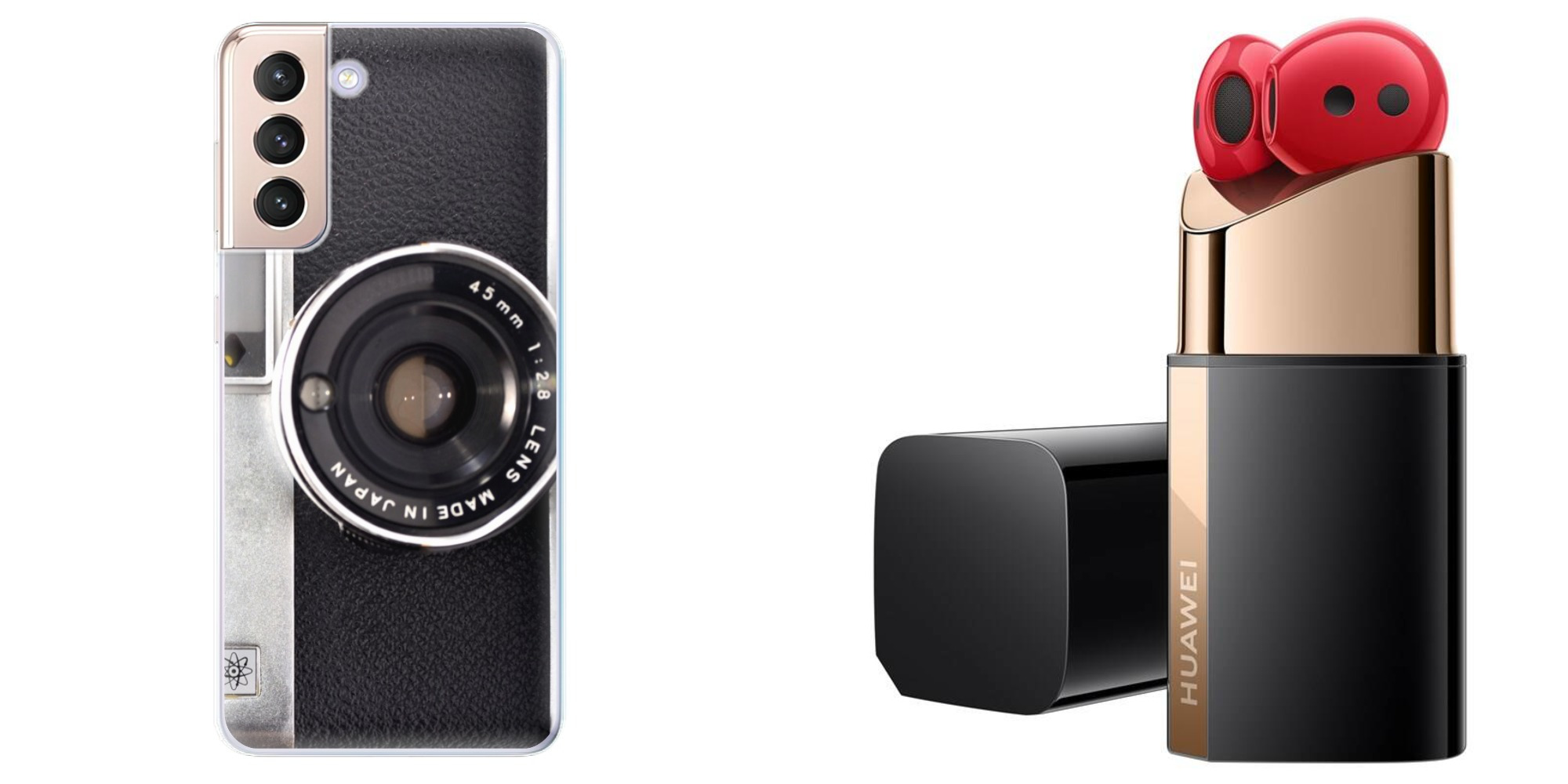 Zleva: obal na Samsung Galaxy S21 iSaprio, 339 Kč; bezdrátová sluchátka Huawei, 5499 Kč