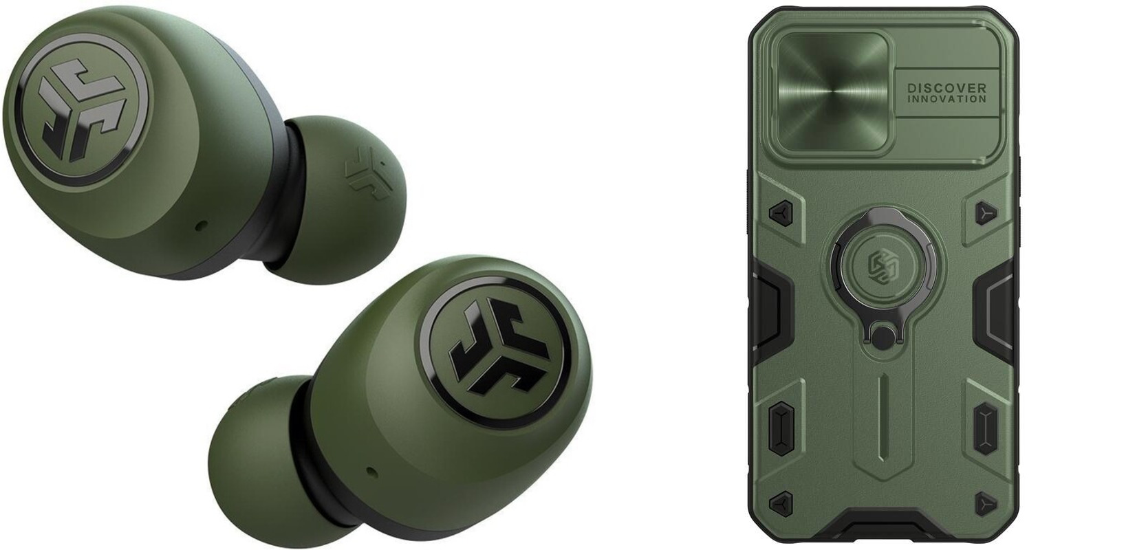 Zleva: bezdrátová sluchátka JLab Go Air (prodává CZC), 599 Kč; obal na iPhone 13 Pro Nillkin (prodává Datart), 499 Kč