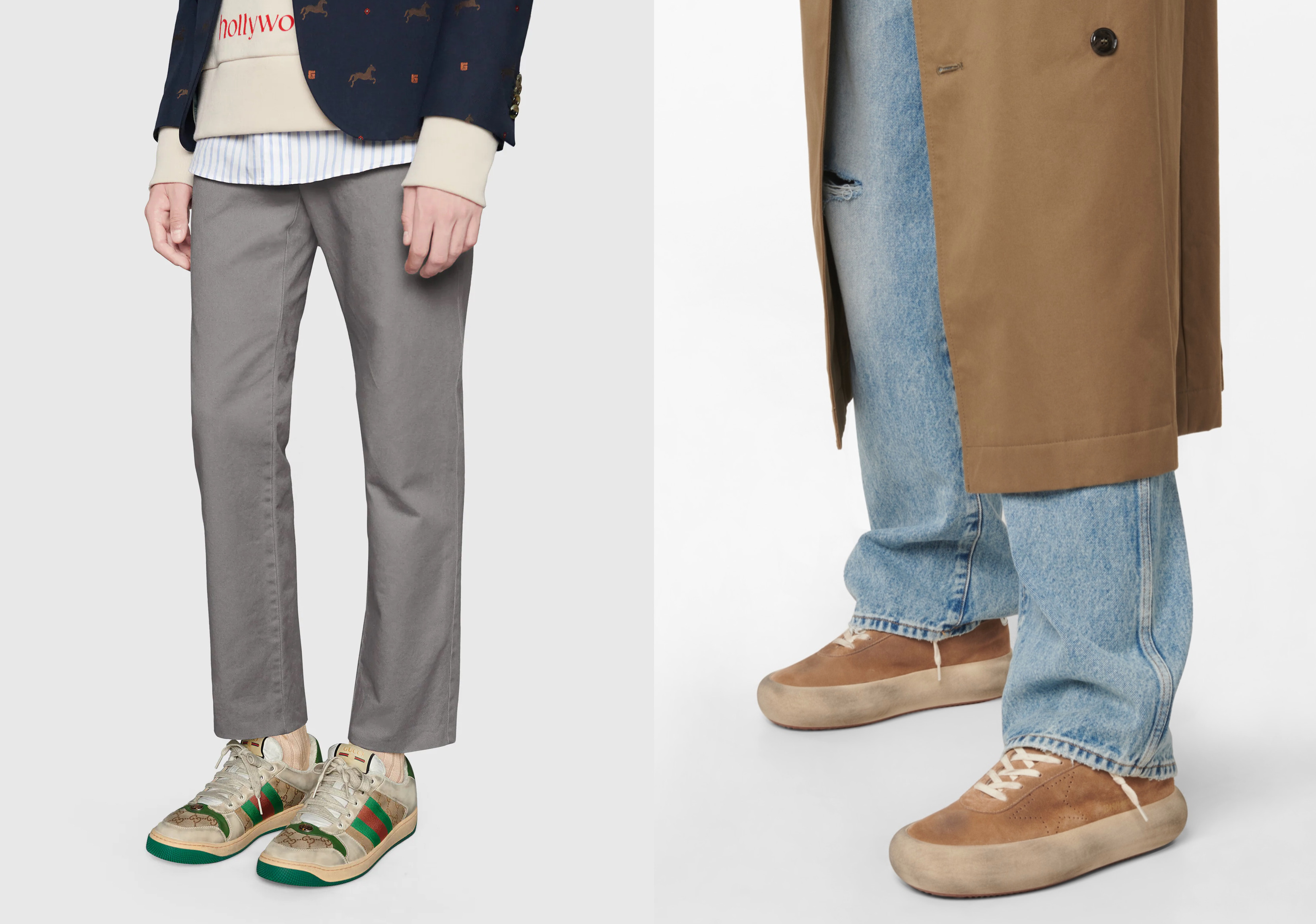 Proč má podobná móda a falešně obnošené kousky úspěch u lidí, kteří se nenachází v tíživé životní situaci, je ovšem záhadou. Jsou snad unaveni z dokonalosti a pozlátka luxusních značek, kterých se na druhou stranu nechtějí vzdát? Přitahuje je zašlý vzhled či laciný design, nebo jen touží po něčem neokoukaném? Tenisky Golden Goose, které by vám babička pravděpodobně vyhodila do popelnice, vypadají značně použitě naschvál. Stejně jako boty značky Gucci. A z obou párů se stal takový hit, že za něj zákazníci neváhají zaplatit nemalou finanční částku.