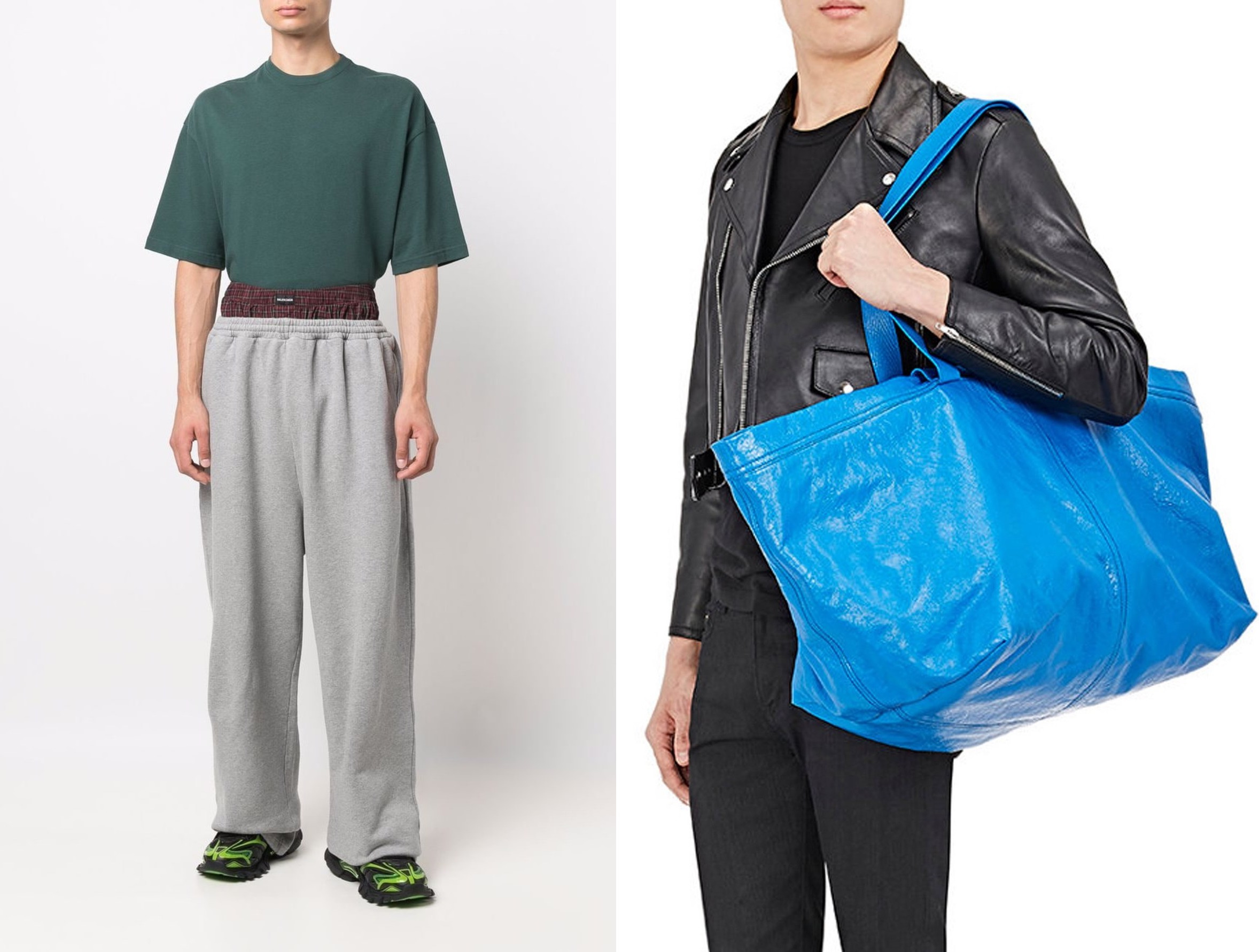 Také v kolekcích značky Balenciaga můžete pravidelně narazit na roztodivné kousky, jejichž skutečnou cenu byste uhodli pouze za předpokladu, pokud byste si všimli, že pochází z dílny španělského tvůrce. Vytahané tepláky s všitými trenkami patří do starší kolekce a protože spadlé kalhoty nosili v devadesátých letech příslušníci amerických černošských gangů a byly zakázané, označili je uživatelé sociálních sítí za rasistické. Modrou koženou tašku připomínající tu ze známého řetězce s nábytkem představila Balenciaga v roce 2017 a prodávala ji za téměř 50 000 českých korun.