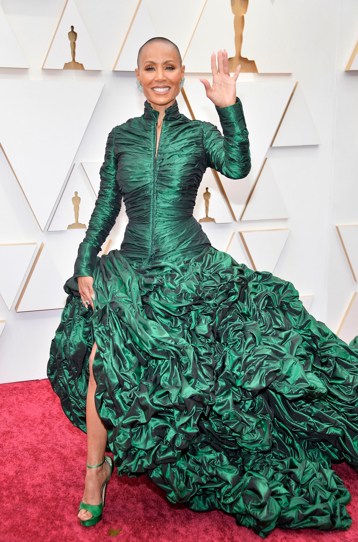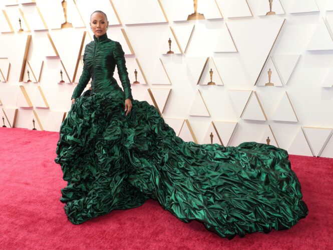Šaty, o kterých se večer (nejen) nejvíce mluvilo, patřily herečce, tanečnici a manželce Willa Smithe (53). Jada Pinkett Smith (50) ukázala, že nuda v jejím šatníku rozhodně nemá místo. No, jen málokdo by měl odvahu obléknout výsledek spolupráce návrhářů Jean Paula Gaultiera a Glenna Martense. Moře volánů a dlouhá vlečka probudily u přítomných všelijaké fantazie. Možná nebudete jediní, komu se při pohledu na tuto exkluzivní róbu vybaví alespoň tři zástupci košťálové zeleniny. A proč dal Will Smith večer facku moderátorovi?