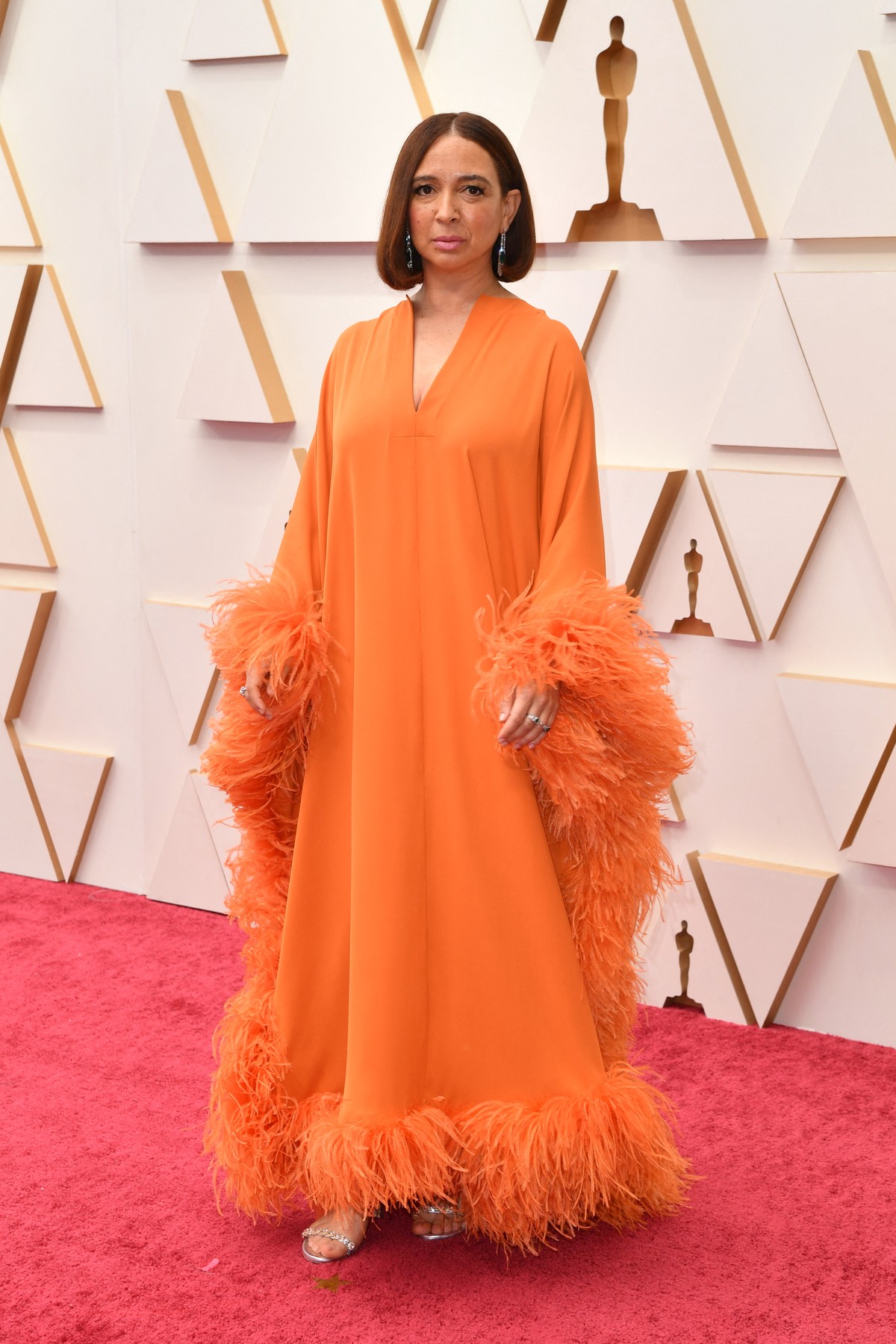 Herečka a komička budila v jasně oranžové róbě od Valentina rozporuplné reakce. Oversized střih a nápadné peříčkové lemování způsobily, že šaty připomínaly spíše luxusní noční košilku než kousek z večírkové kolekce. Na rozdíl od některých účastnic si však Maya Rudolph (49) nemohla stěžovat na diskomfort a bát se nemusela ani faux pas v podobě vykukující podprsenky či kalhotek.
