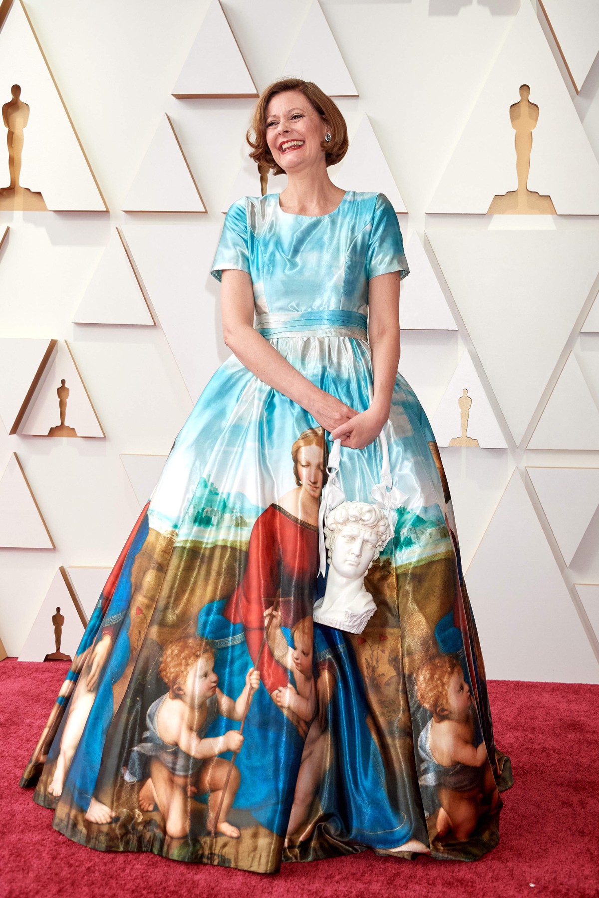 Pocta renesanci! Tak by se dal nazvat outfit této umělecké maskérky. Ta byla za svou práci s make-upem a vlasovým stylingem ve snímku Duna nominována na Oscara, ale soška jí bohužel unikla. Na červený koberec dorazila Švédka Eva von Bahr (53) v prazvláštních šatech s vyobrazením malby Madonna del Prato známého malíře Raphaela. Zajímavým detailem byla také kabelka ve tvaru sochy.