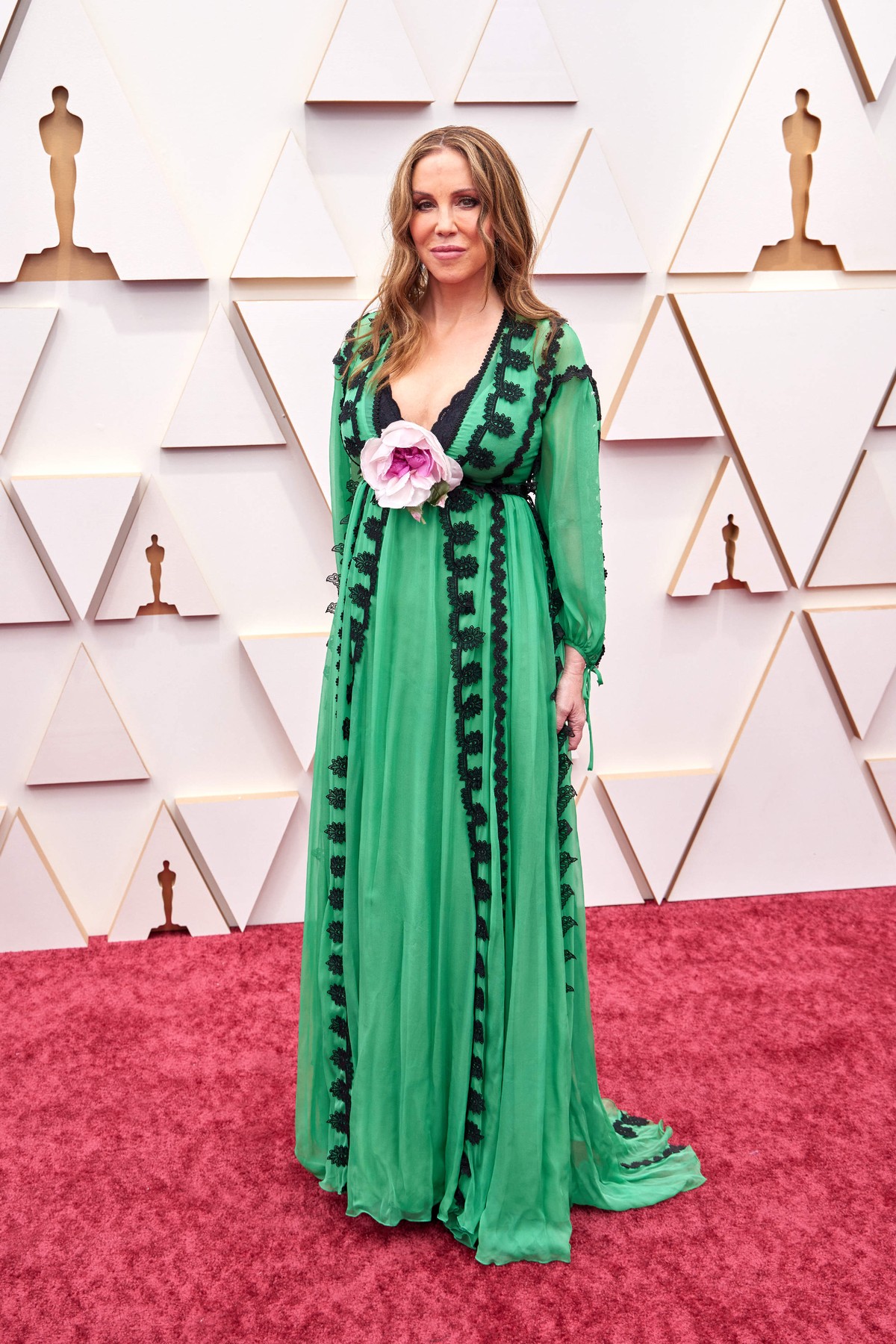 Filmová producentka, která má na svědomí i snímek Duna, oblékla zelené šaty s černým vzorem, které by se hodily spíš na méně velkolepou událost. Nejhorším prohřeškem, jehož se dopustila, byla ovšem růžová květina ve výstřihu. U módní policie kvůli tomu úplně propadla. Tak třeba se to Mary Parent (54) povede příště.