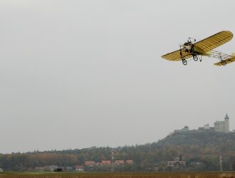 PARDUBICE, CZECH REPUBLIC - NOVEMBER 05: Pilot Petr Mara flies with the Bleriot replica plane from Pardubice to Prague to commemorate the centenary anniversary of