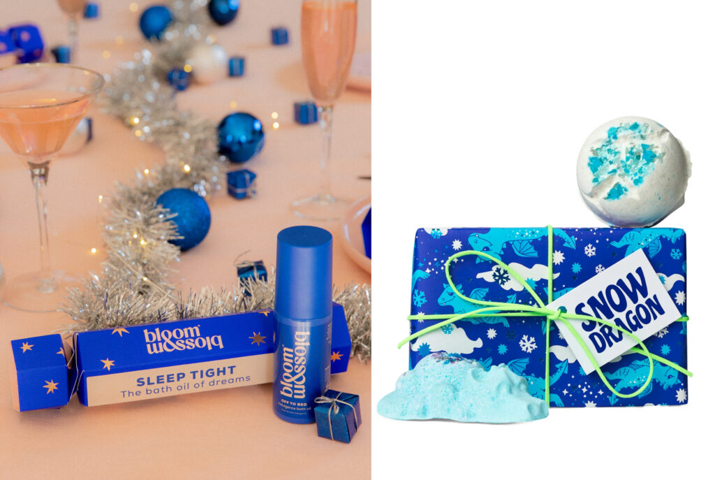 Zleva: olej do koupele pro zmírnění napětí a uvolnění od stresu ve vánočním balení Bloom & Blossom (prodává Madeformoms), 470 Kč; dvě koupelové bomby v dárkové sadě Lush, 400 Kč