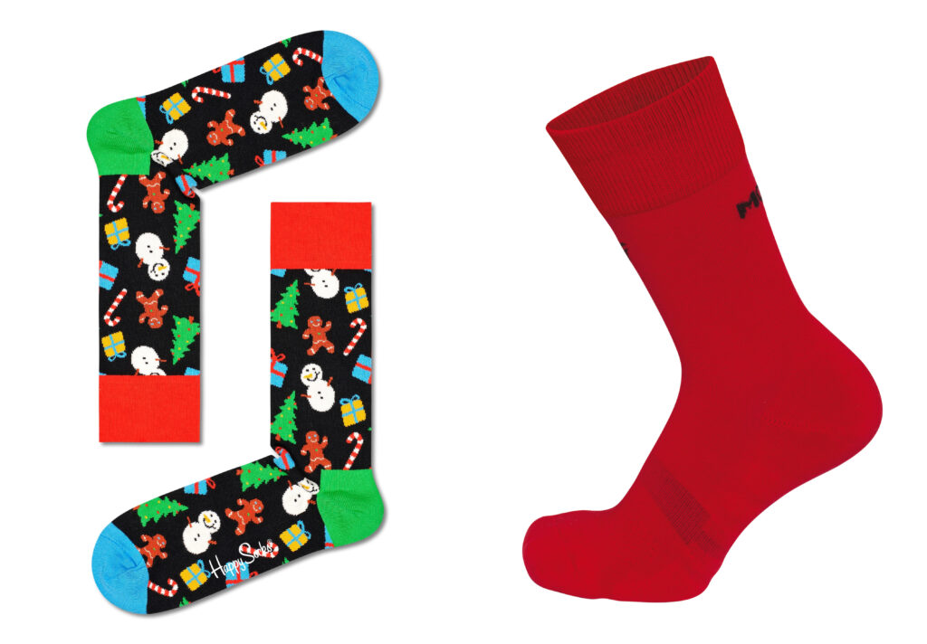 Zleva: ponožky s vánočním motivem Happy Socks (prodává Urbanlux), 319 Kč, červené fusekle v červené barvě Moira, 245 Kč