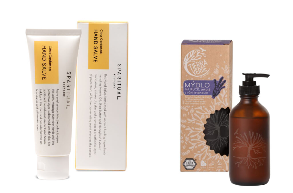 Zleva: citrusový krém na ruce s marula olejem i bambuckým máslem SpaRitual, 477 Kč; tekuté mýdlo na ruce s vůní levandule Thierra Verde, 169 Kč