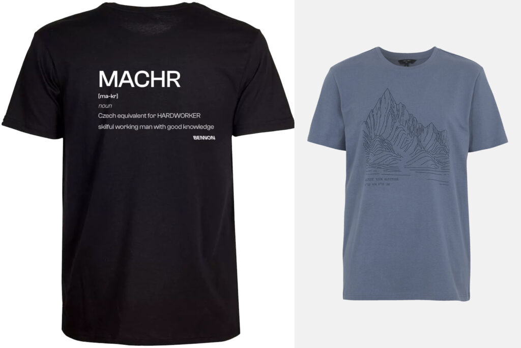 Zleva: černé tričko s nápisem Bennon, 349 Kč; šedé bavlněné triko s obrázkem Cellbes, 499 Kč