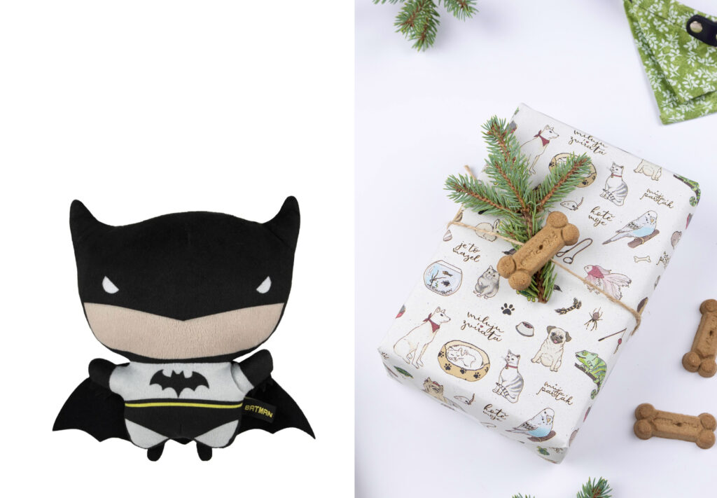 Zleva: plyšová hračka pro psy Batman (prodává Bezvasport), 329 Kč; balicí papír pro mazlíčky od designérky Gabriely Hrábkové (prodává Obchodpromazlicky), od 30 Kč za arch
