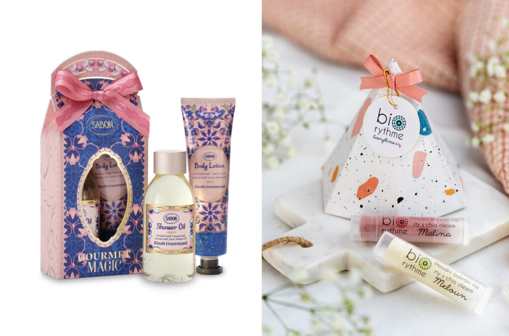 Zleva: set sprchového oleje (100 ml) a tělového mléka (50 ml) ve speciální sváteční limitované edici s sebou můžete vzít i do letadla Sabon, 390 Kč; melounový a malinový balzám na rty v originální dárkové krabičce Biorythme, 329 Kč