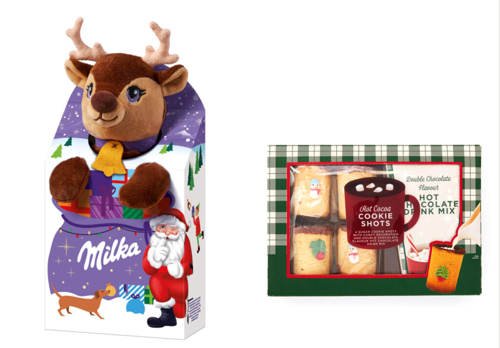 Zleva: plyšová hračka (na výběr je ze tří postaviček: Santa Claus, sob nebo medvídek) s bohatou nadílkou plnou alpské čokolády Milka, 200 Kč; sada horké čokolády a vánočních sušenek Primark, 245 Kč
