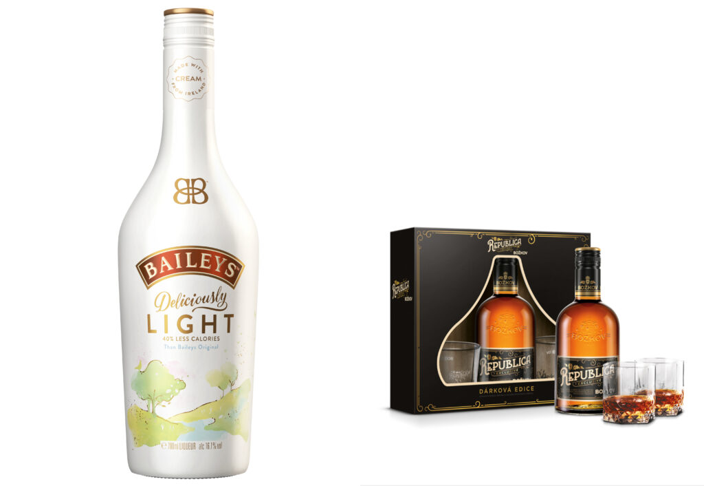 Zleva: oblíbený likér v odlehčené variantě, který má o 40 % méně cukru i kalorií Baileys Deliciously Light, 369 Kč/ 0,7 l; jantarový rum Božkov Republica Exclusive ve stylovém balení s na míru vyrobenými skleničkami, 399 Kč (oba dárky prodává Bartidashop)