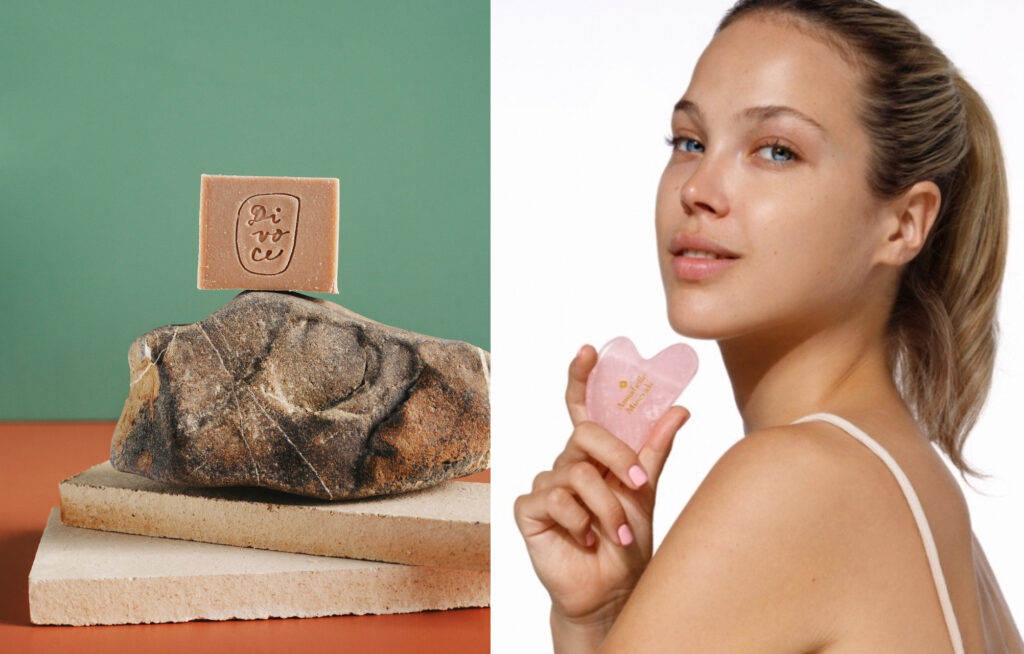Zleva: ručně vyráběné solné mýdlo s růží a geránií Divoce (prodává Divoce.eu), 330 Kč; masážní kámen Gua sha na obličej z růženínu Annabelle Minerals, 379 Kč