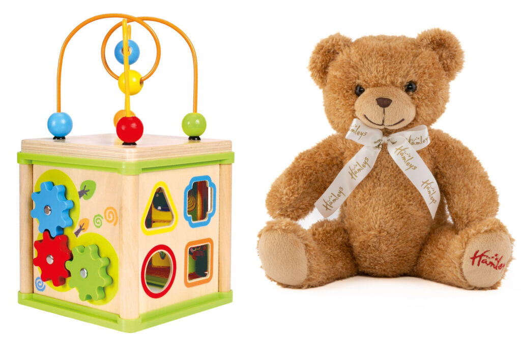 Zleva: multifunkční motorická kostka procvičuje jemnou motoriku ruky, logiku i soustředěnost Bino (prodává Bino-drevenehracky), 465 Kč; plyšový medvídek Hamleys (prodává Jabadaba), 463 Kč